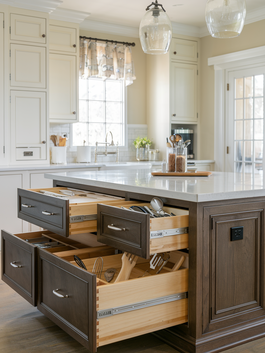 Incorporating hidden storage into your island is one of the smartest ways to maintain a clean and organized kitchen. Deep drawers and concealed cabinets can store everything from utensils and cookware to small appliances, keeping countertops free from clutter. This thoughtful design enhances efficiency by ensuring everything has its place while maintaining a sleek and polished appearance. It’s a subtle feature that significantly improves both functionality and the overall aesthetic of your kitchen.