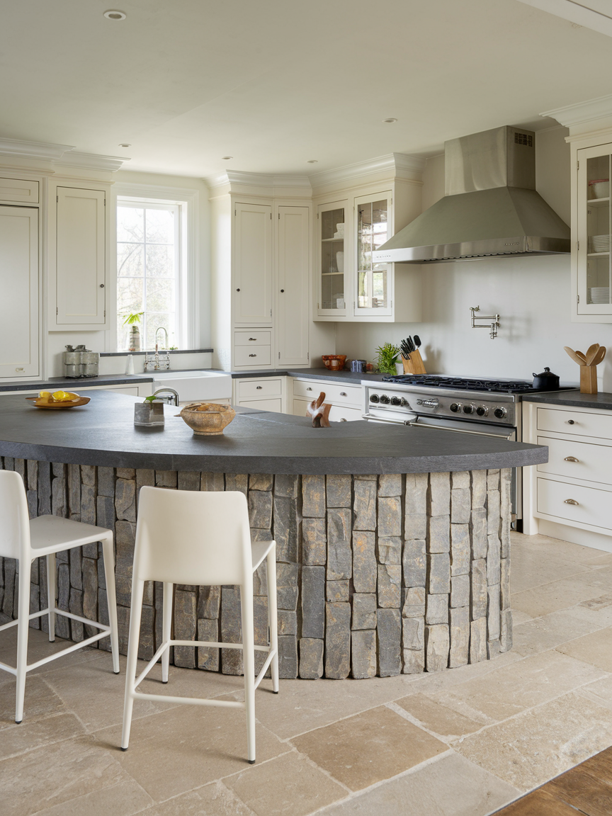 Curved islands introduce softness and flow into the kitchen, breaking away from traditional straight lines. Their rounded edges create a more inviting and organic feel while improving movement around the space. They are also a safer option for families with children. Beyond practicality, curved designs add a unique and sophisticated touch that makes your kitchen feel more custom and visually interesting.