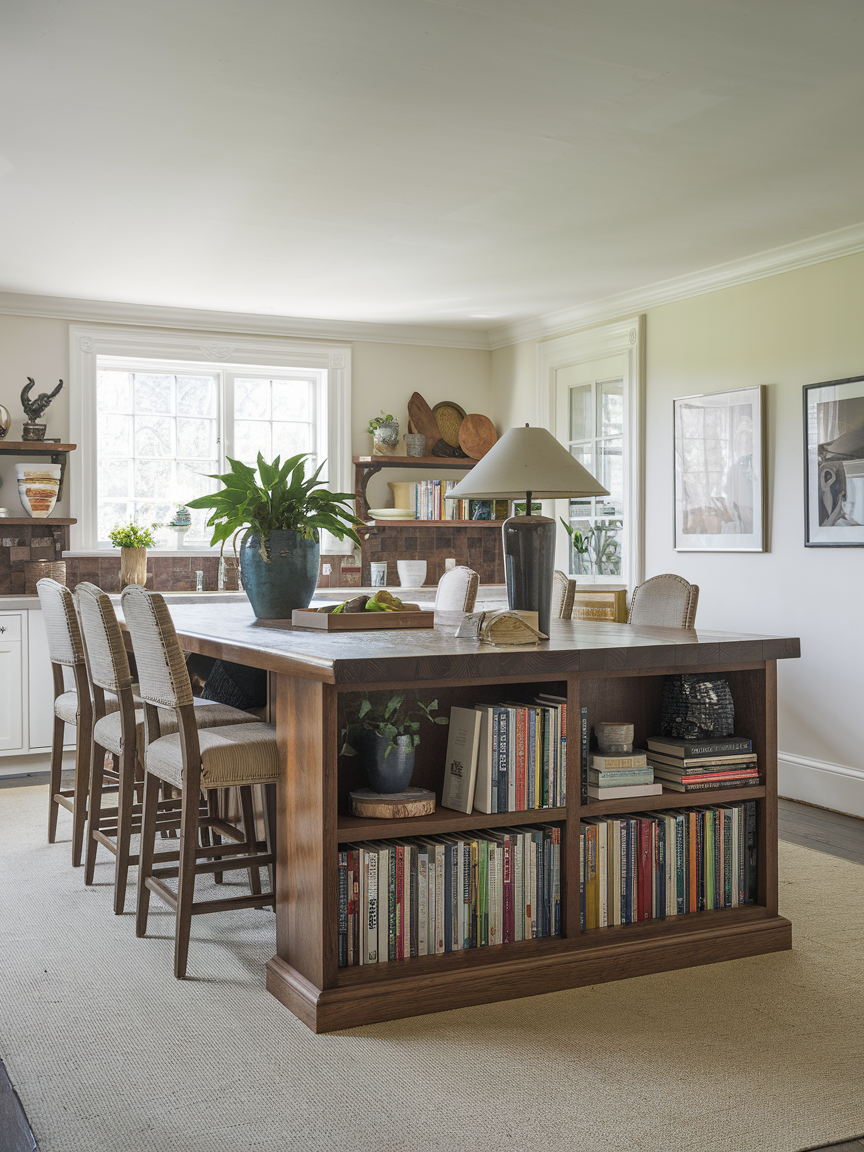 Adding built-in bookshelves to your island transforms it into a functional and decorative centerpiece. These shelves provide a convenient spot for storing cookbooks, displaying ceramics, or showcasing small plants and decorative accents. This feature adds personality and charm while keeping frequently used items within easy reach. It also allows you to rotate decor seasonally, giving your kitchen a fresh and evolving look without major changes.