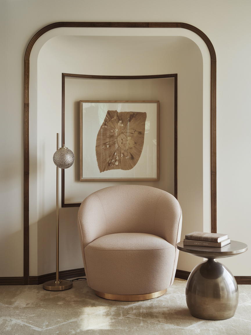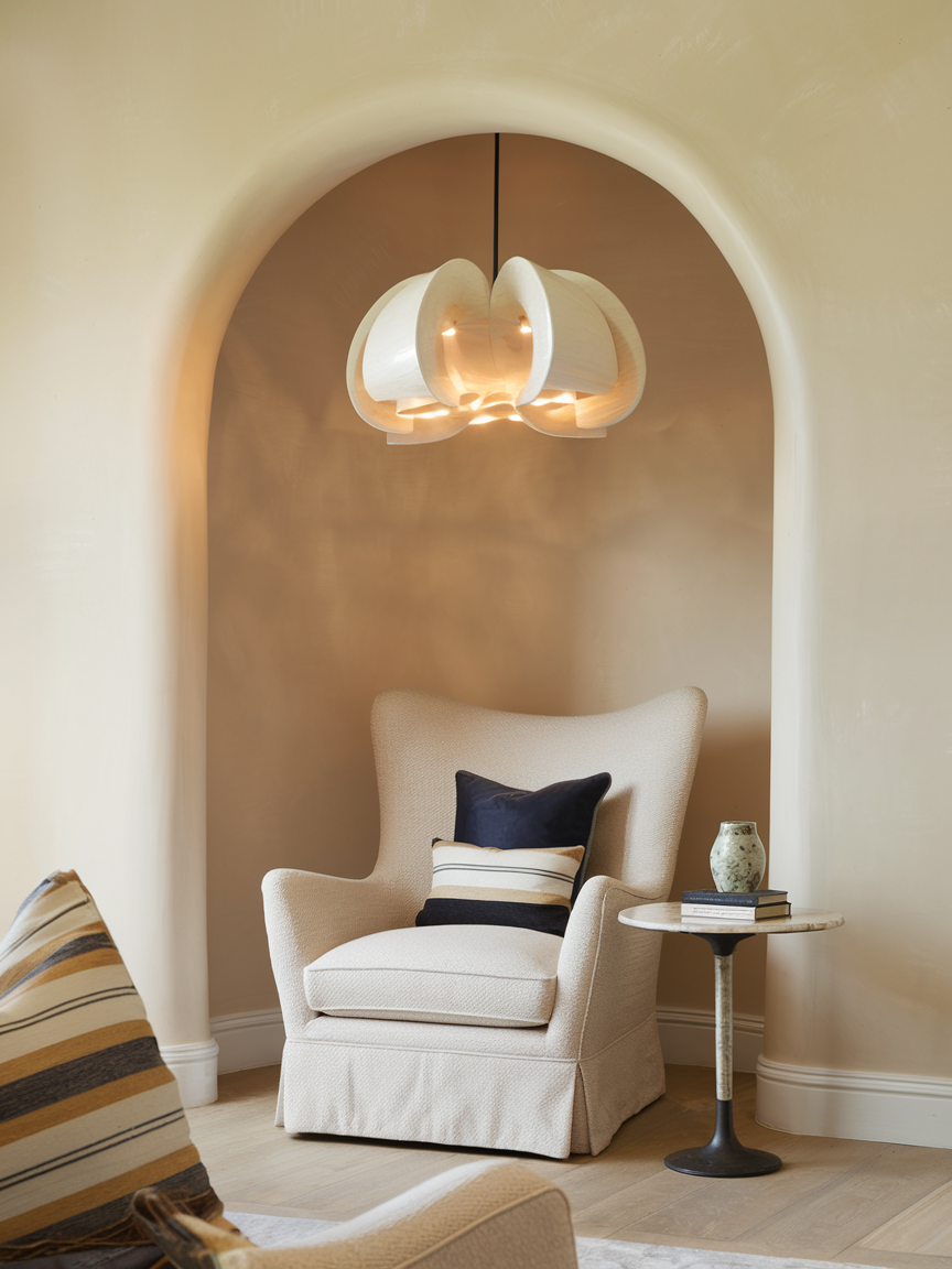 Elevate a simple seating area by making lighting the focal point. Position a stylish floor lamp, sculptural pendant, or adjustable wall sconce above your chair to create both function and visual impact. Pair the lighting with a comfortable seat, a small table, and minimal décor to keep the focus on the design feature. Warm light helps define the nook and creates a cozy atmosphere during the evening. This idea works well in modern or contemporary interiors where a single bold element can transform a corner into a stylish and intentional living space.