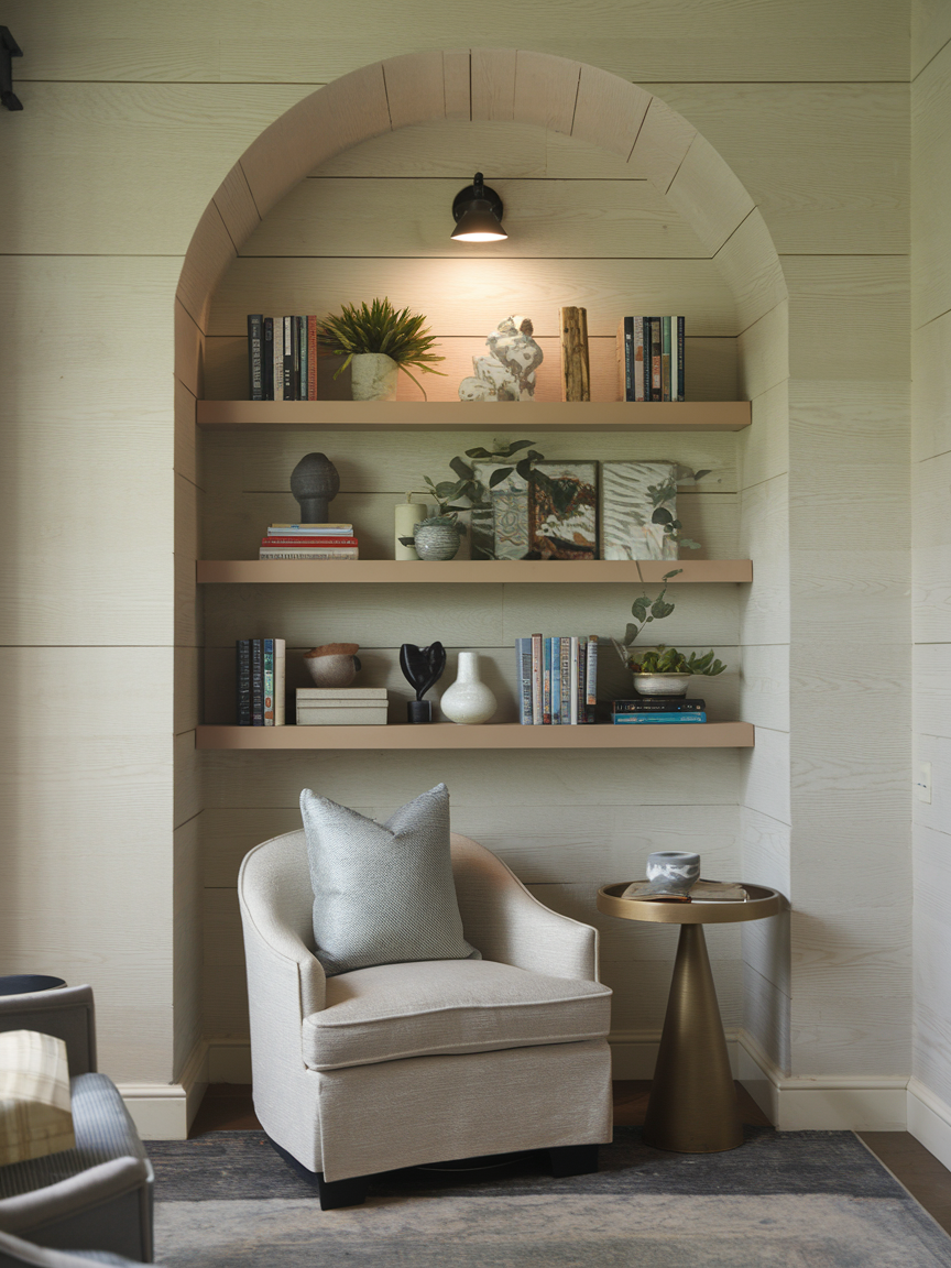 Turn a quiet corner into a charming relaxation spot by installing floating shelves above a comfortable chair or compact bench. Use the shelves to display books, small plants, candles, or decorative objects that reflect your personality. A small round side table or narrow console can hold your coffee or tea, making the space perfect for slow mornings or evening breaks. Choose light wood or neutral finishes to keep the area feeling open and airy. Soft lighting from a wall-mounted sconce or nearby lamp enhances the cozy atmosphere. This type of nook works especially well in smaller living rooms, offering both visual interest and practical storage without taking up valuable floor space.