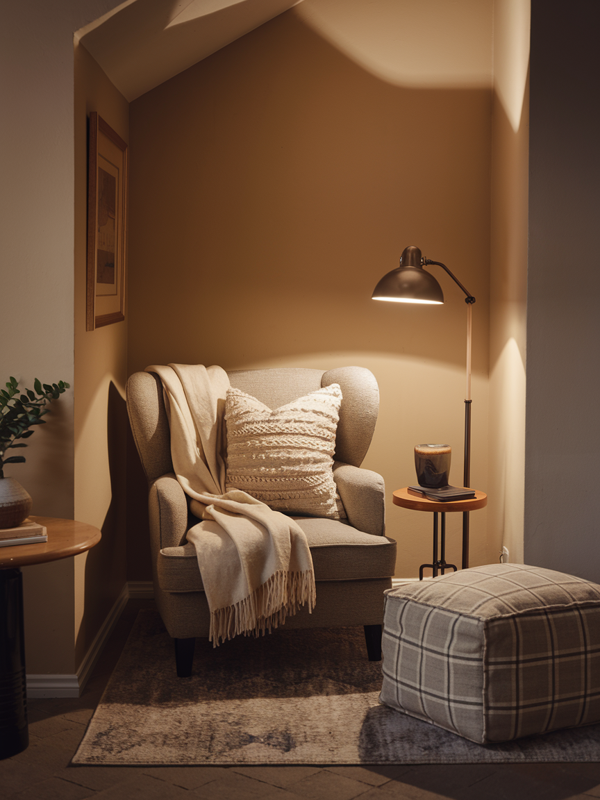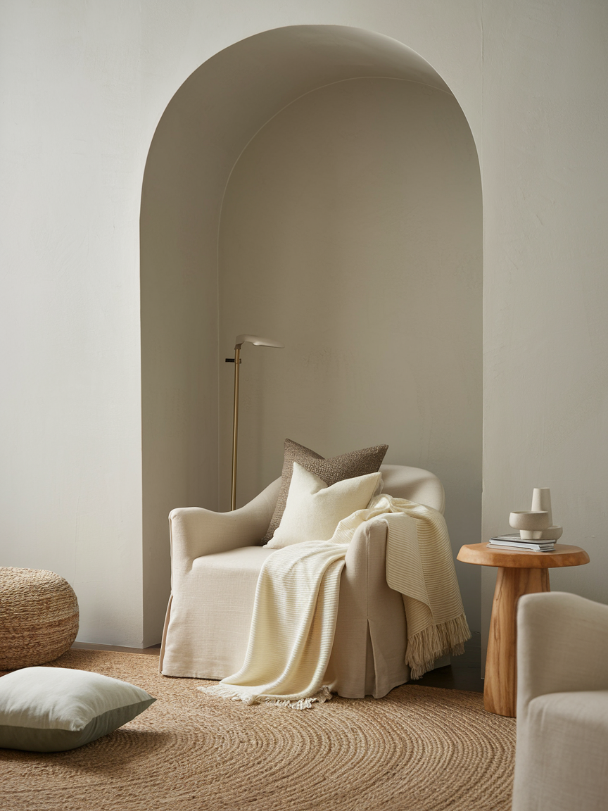 Create a calming retreat by designing a nook around a soft neutral color palette. Choose a comfortable armchair in shades of beige, cream, or light gray, and layer it with textured pillows and a cozy knit throw. Add a natural fiber rug to anchor the space and bring warmth underfoot. A wooden side table and a simple floor lamp complete the look without overwhelming the design. Neutral tones help the nook blend seamlessly into the living room while creating a peaceful atmosphere that encourages relaxation. This approach works beautifully in minimalist, modern, or Scandinavian-inspired interiors where comfort and simplicity are the main focus.