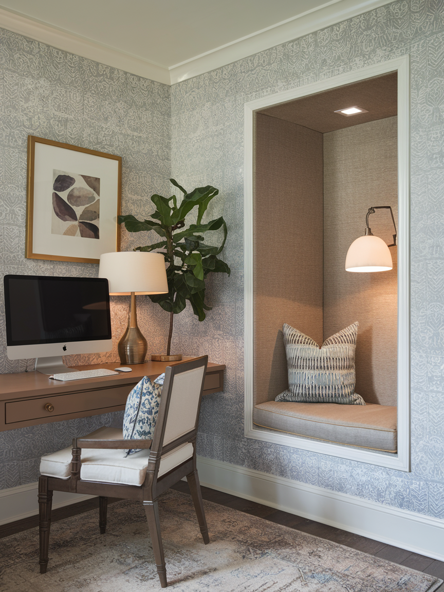 Combine productivity and comfort by creating a small dual-purpose nook. Place a compact desk or wall-mounted work surface next to a comfortable chair, allowing the area to function as both a workspace and a relaxation zone. Use soft lighting, organized storage, and minimal décor to keep the space tidy and inviting. Adding a plush cushion or throw helps the nook transition easily from work mode to a quiet reading or scrolling spot. This setup is ideal for modern homes where flexibility is essential. It allows you to maximize a small corner while maintaining a balanced environment that supports both focus and everyday comfort.