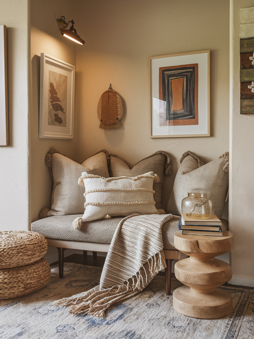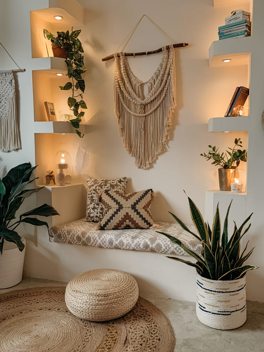 Layer patterns, textures, and natural materials to create a relaxed boho-inspired corner. Use a comfortable chair or floor seating with patterned pillows, macramé accents, and woven rugs. Plants and warm lighting add to the relaxed atmosphere. The key to a successful boho nook is mixing elements while keeping the color palette cohesive. This style creates a laid-back space that feels creative, comfortable, and full of personality.