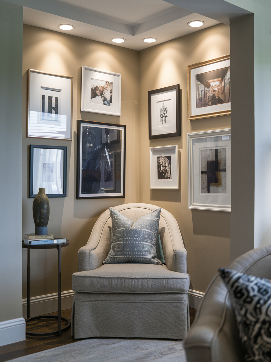 Define your seating area by creating a small gallery wall behind it. Arrange framed artwork, photographs, or prints in a cohesive color scheme to give the nook a personalized and artistic touch. Pair the wall display with a comfortable chair and a small table to create a balanced composition. The artwork draws attention to the space, making the corner feel intentional rather than leftover. Soft lighting, such as a picture light or floor lamp, enhances the visual impact while keeping the area functional. A gallery nook adds personality and style while providing a comfortable place to sit, read, or relax.