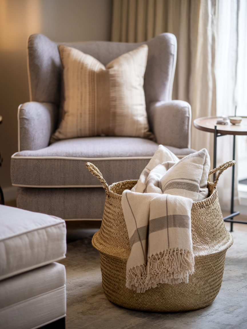 Keep comfort within reach by adding a decorative basket filled with soft throws next to your seating area. Choose a comfortable chair and layer it with pillows that match your living room palette. The blanket basket adds texture and practicality while encouraging daily use of the space. Natural materials such as woven seagrass or rattan enhance the warm and relaxed feel. Pair the setup with a small side table and gentle lighting to complete the nook. This simple addition makes the corner feel inviting, functional, and perfect for cozy evenings at home.