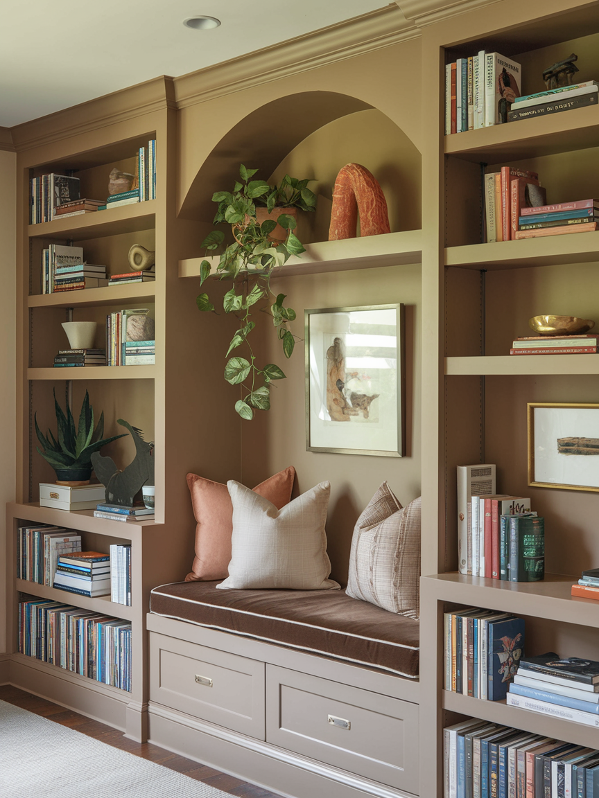 Built-in shelves surrounding a cozy seat create a charming and practical living room nook. This design keeps books organized while framing the seating area as a focal point. Use a cushioned bench or a compact loveseat and add layers of soft textiles for comfort. Decorative accents such as plants, framed art, and small objects bring personality to the shelves. Built-ins help maximize vertical space and keep the area tidy, making the room feel structured and balanced. This nook is ideal for readers and anyone who enjoys a quiet, organized environment that combines storage with a comfortable place to unwind.