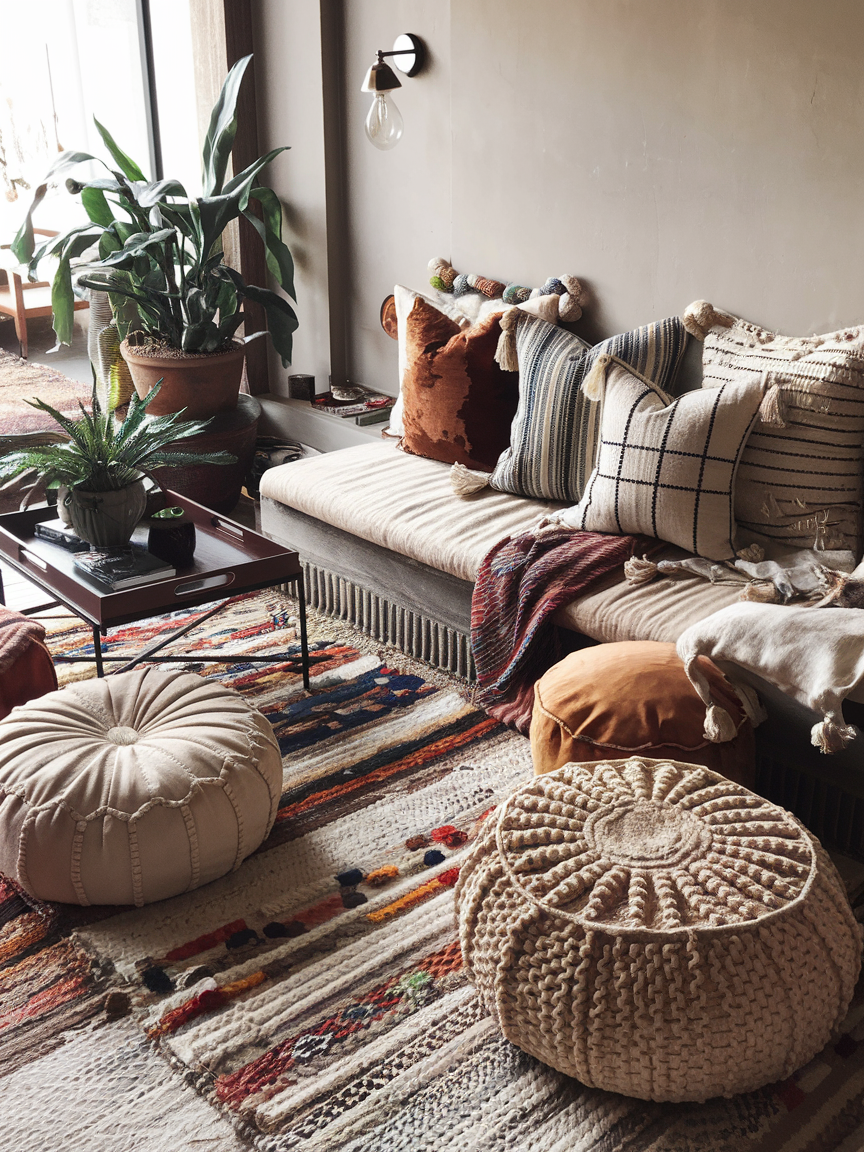 For a relaxed and casual feel, create a floor seating nook using layered rugs, large cushions, and poufs. This setup encourages a laid-back lifestyle and works beautifully in boho, modern, or family-friendly spaces. Choose soft, durable fabrics and mix textures to add visual interest. A low tray table can hold books, drinks, or decorative items. Adding a nearby floor lamp or wall sconce ensures the area remains functional in the evening. Floor seating is a flexible option that can easily be rearranged or expanded, making it perfect for small spaces or homes that value comfort and versatility.