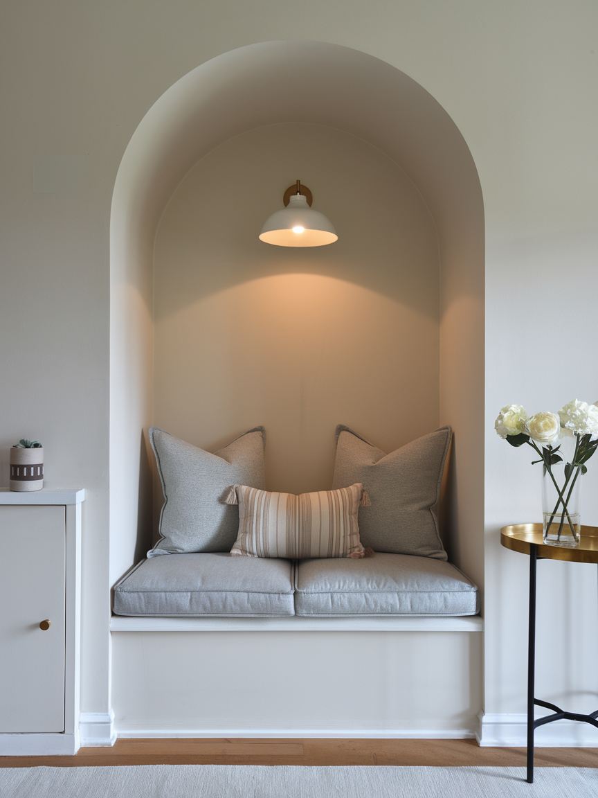 Create a sleek and sophisticated look by designing your nook in a monochrome palette. Choose furniture, textiles, and décor in varying shades of the same color, such as gray, beige, or soft taupe. Mixing tones and textures prevents the design from feeling flat while maintaining a cohesive appearance. A modern chair, simple side table, and minimalist lighting keep the space refined and uncluttered. This style works beautifully in contemporary interiors and helps the nook feel calm, balanced, and visually polished.