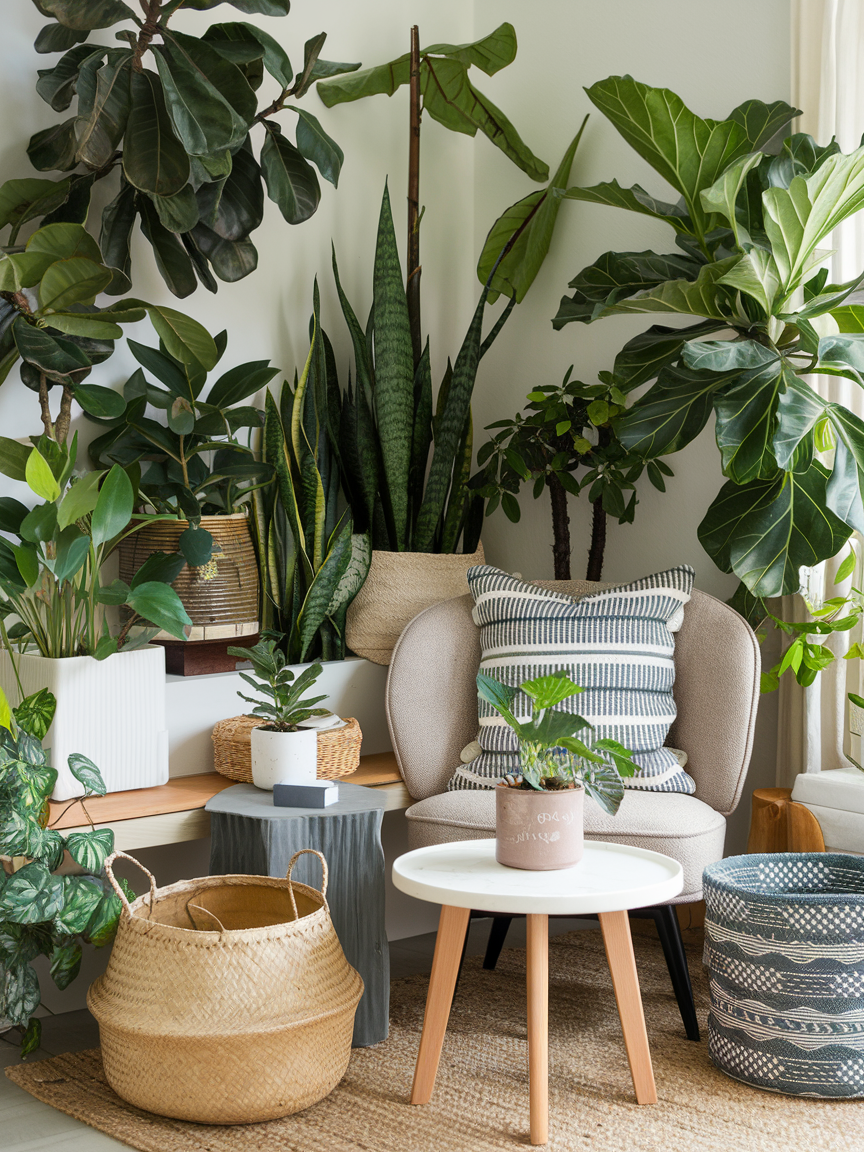 Surround your seating area with indoor plants to create a refreshing and calming atmosphere. A comfortable chair paired with a variety of greenery adds life, texture, and natural beauty to the corner. Choose plants with different heights and leaf shapes to create visual depth. Natural materials like wood, linen, and woven baskets enhance the organic feel. This type of nook promotes relaxation and brings a sense of nature indoors, making the living room feel more vibrant, balanced, and inviting for everyday living.
