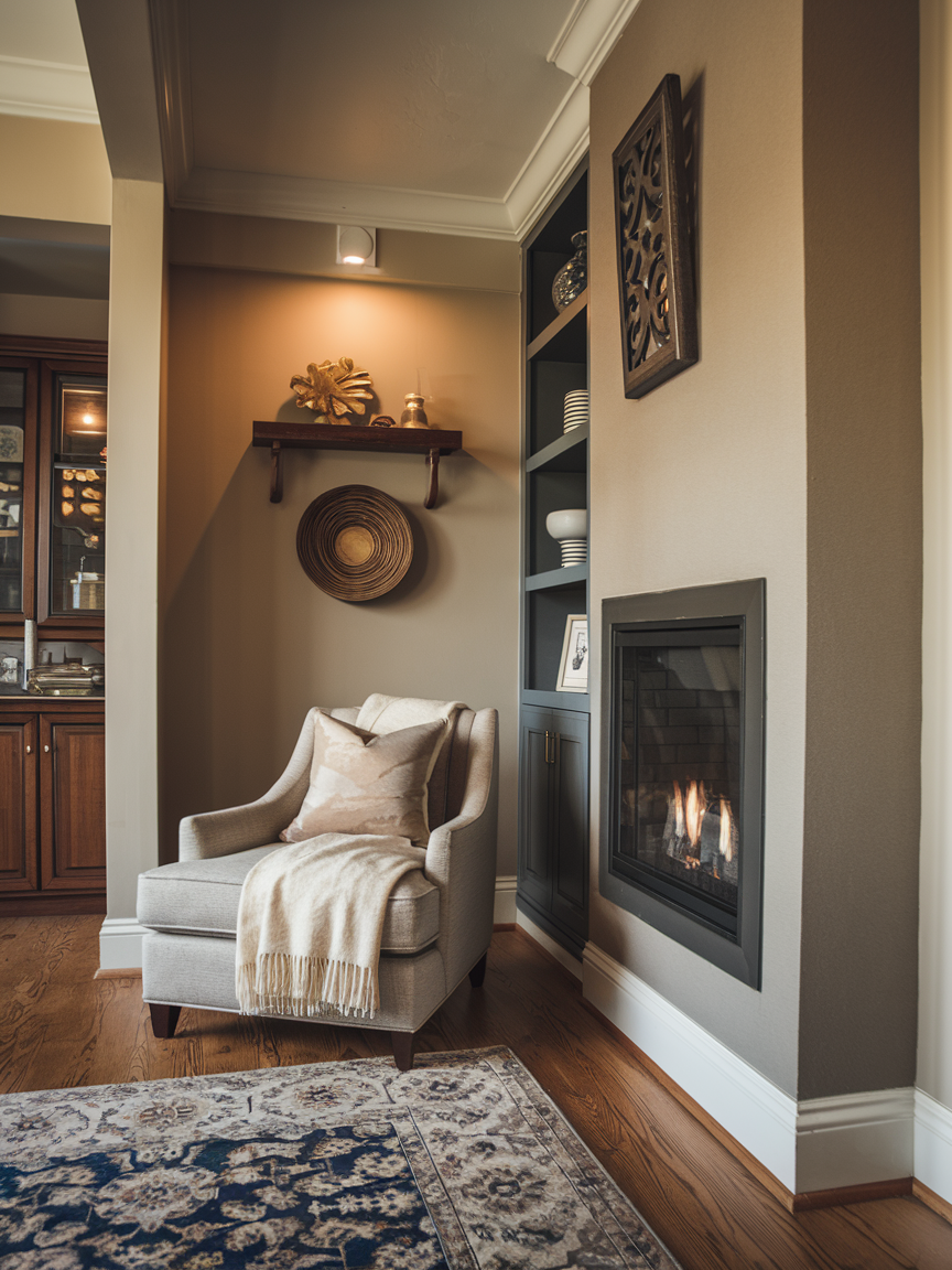 If your living room includes a fireplace, use the adjacent space to create a cozy seating nook. A comfortable chair or small bench placed near the warmth becomes an inviting spot during cooler seasons. Add a soft throw blanket and warm lighting to enhance the cozy atmosphere. This arrangement helps balance the room layout while making the fireplace area more functional. A fireplace nook naturally encourages relaxation and creates a welcoming environment that feels perfect for quiet evenings.