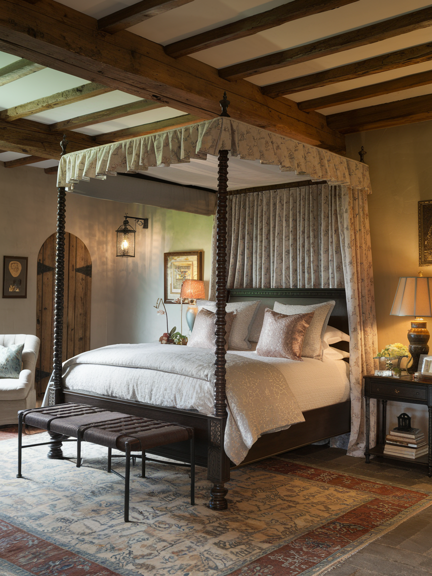 A four-poster bed instantly brings structure, presence, and a sense of grandeur to a traditional bedroom. Its tall frame naturally draws the eye upward, making the room feel more expansive and architecturally interesting. Opting for darker wood tones creates a more formal, stately atmosphere, while lighter finishes introduce a softer and more relaxed aesthetic. Draping sheer or lightweight fabric across the posts can soften the overall look and add a romantic, cocoon-like feel. This type of bed doesn’t just serve as furniture, it becomes the defining centerpiece that anchors the entire room with timeless elegance.