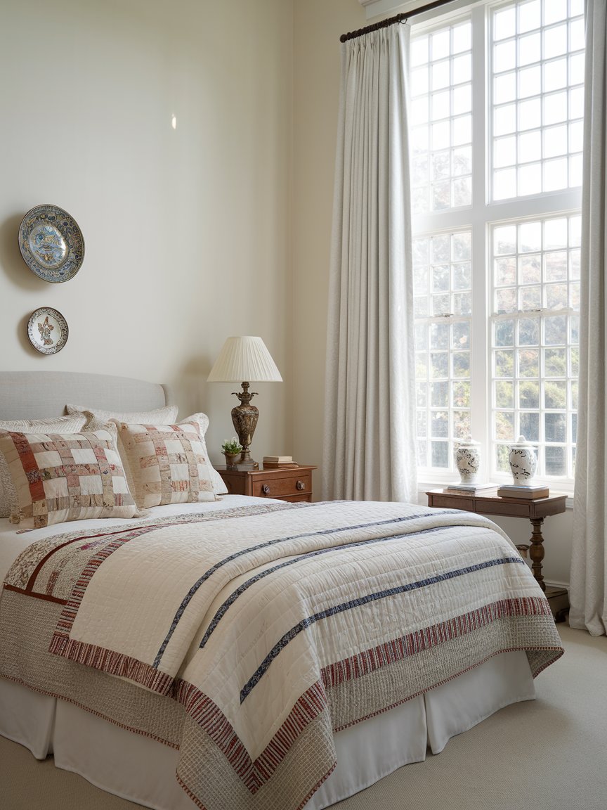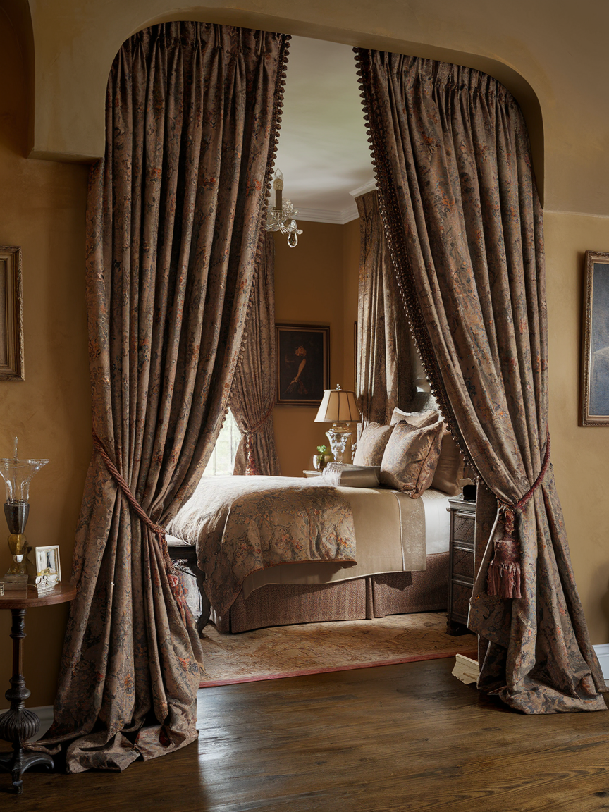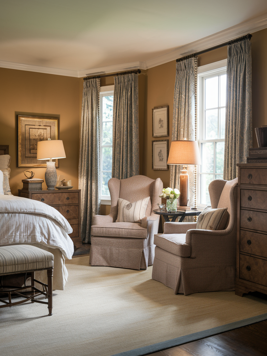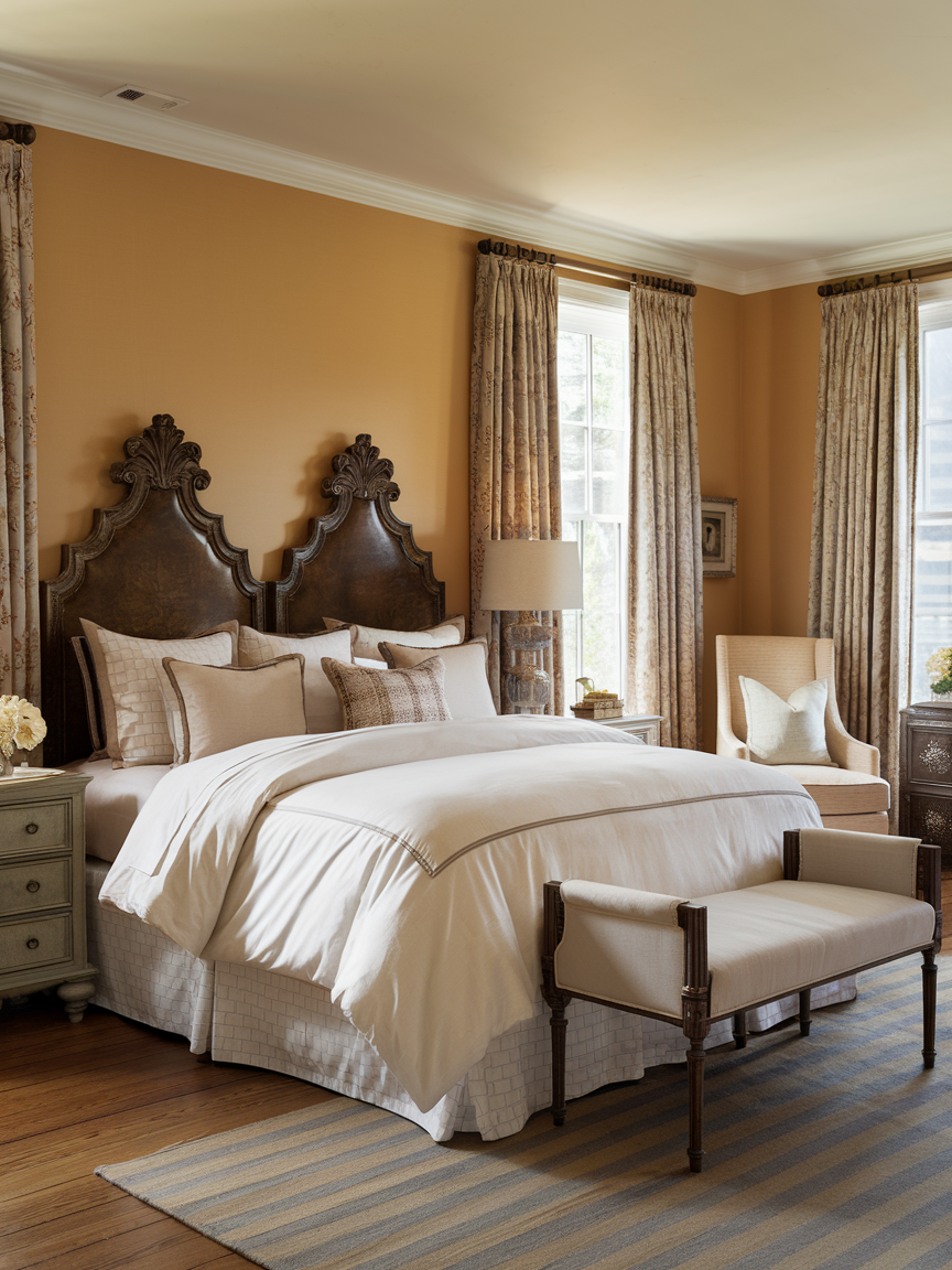 Floor-length drapery adds a sense of height, elegance, and softness to a traditional bedroom. Rich fabrics like velvet, silk, or heavyweight cotton create a luxurious look while also enhancing the room’s warmth. Patterns such as florals or damask introduce subtle visual interest without overwhelming the design. Beyond their aesthetic value, curtains provide essential functionality by controlling natural light and ensuring privacy. When chosen carefully, drapery becomes an integral design element that frames the room beautifully and contributes to its refined ambiance.