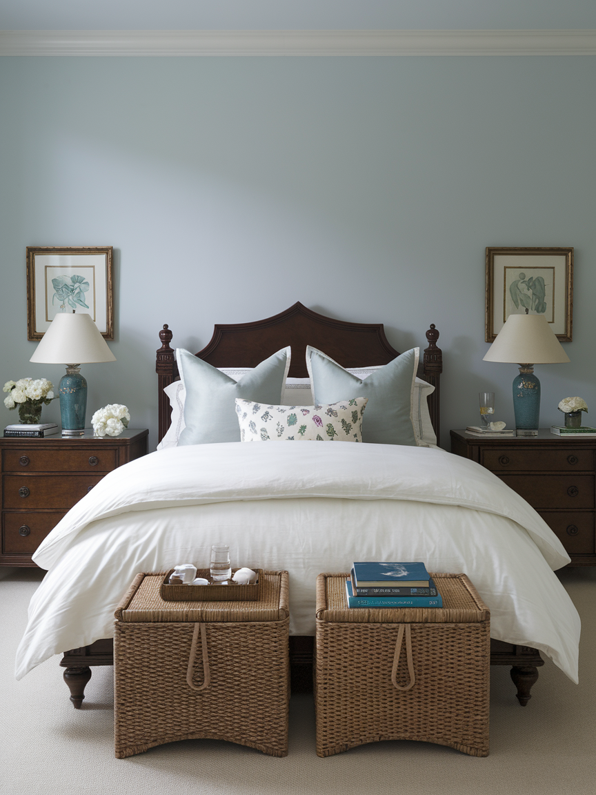 Wall art adds personality and depth to a traditional bedroom without overwhelming the space. Carefully chosen pieces such as framed paintings, botanical prints, or vintage-inspired illustrations create a curated and refined look. Rather than filling every wall, focusing on a few meaningful artworks allows each piece to stand out. Elegant frames further enhance the overall aesthetic, tying the artwork into the room’s classic design language.