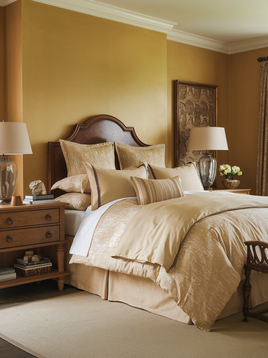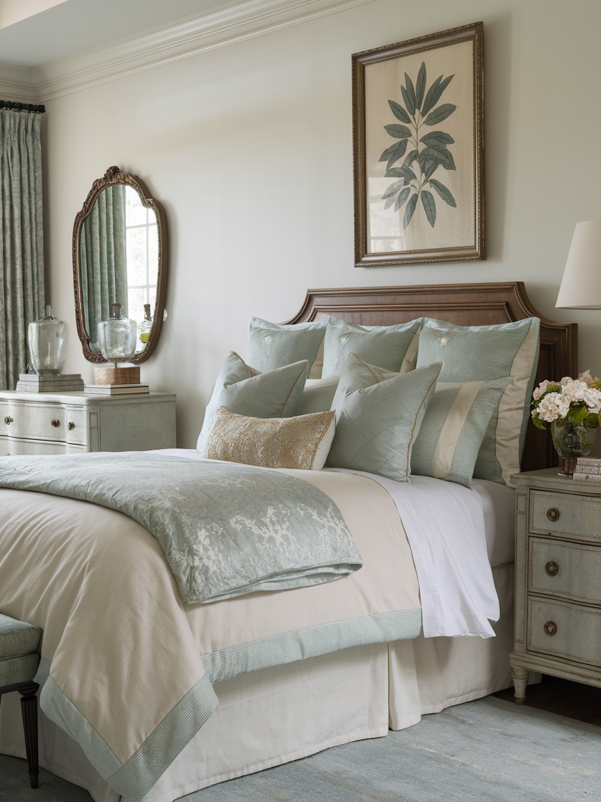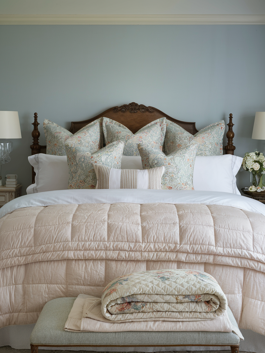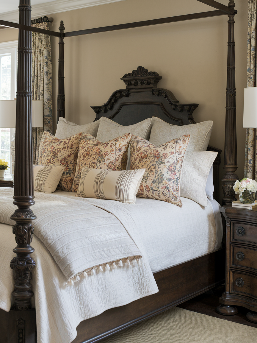 Throw pillows are an easy way to introduce texture, color, and visual interest into a traditional bedroom. Mixing fabrics such as velvet, brocade, and embroidered textiles creates a layered and inviting look. These small accents allow for subtle experimentation with patterns and tones while maintaining the overall harmony of the space. They complete the bed’s styling, making it feel polished and thoughtfully arranged.