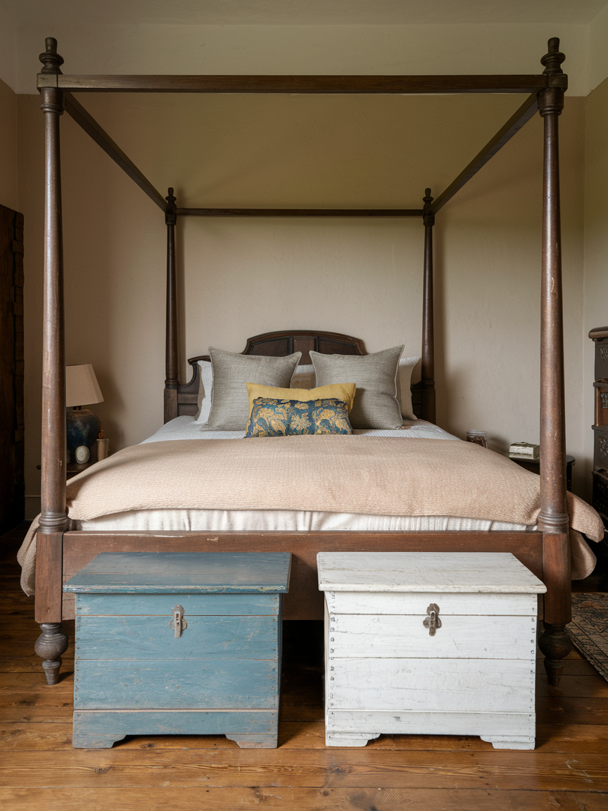 A wooden chest placed at the foot of the bed adds a timeless and practical touch to the room. It serves as additional storage for blankets, linens, or seasonal items while also enhancing the traditional aesthetic. The presence of a chest introduces a sense of heritage and continuity, evoking the charm of classic interiors. Its dual function makes it both a decorative and highly useful addition.
