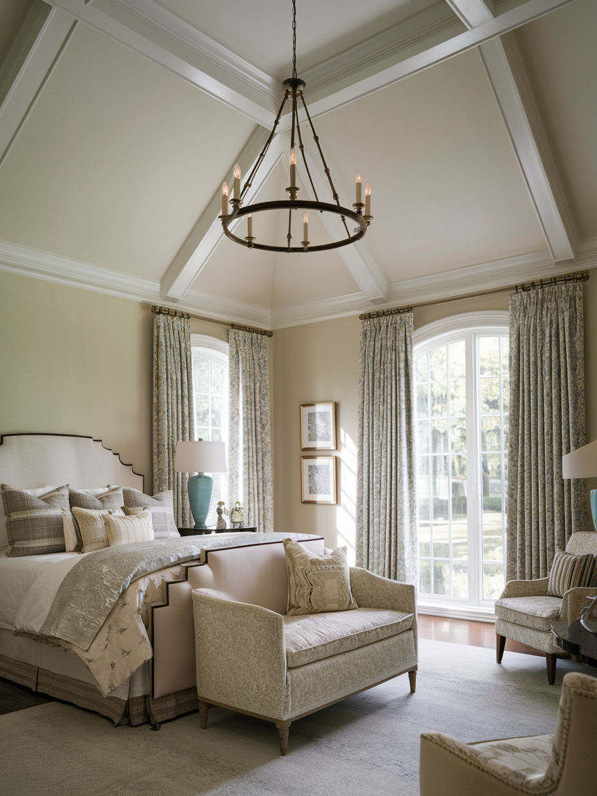 A chandelier adds a striking focal point that elevates the elegance of a traditional bedroom. Whether featuring crystal details or wrought iron designs, it introduces a sense of luxury and refinement. The soft illumination it provides enhances the room’s ambiance, especially when paired with dimmable lighting. This element not only improves functionality but also reinforces the timeless aesthetic of the space.