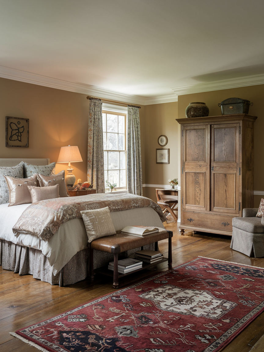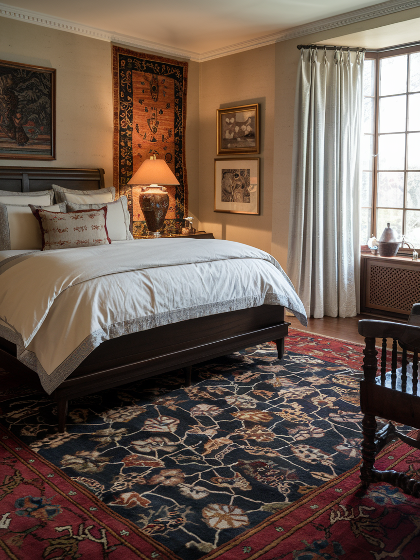 A plush area rug transforms the bedroom into a warm and inviting retreat by adding softness underfoot and visual cohesion throughout the space. Traditional rug styles, such as Persian or oriental-inspired patterns, introduce intricate detail and a sense of heritage. Alternatively, neutral or subtly textured rugs can create a more understated, relaxed feel. Rugs also help define the layout of the room, anchoring furniture and tying different elements together. This layer of comfort enhances the overall atmosphere, making the space feel thoughtfully designed and effortlessly cozy.