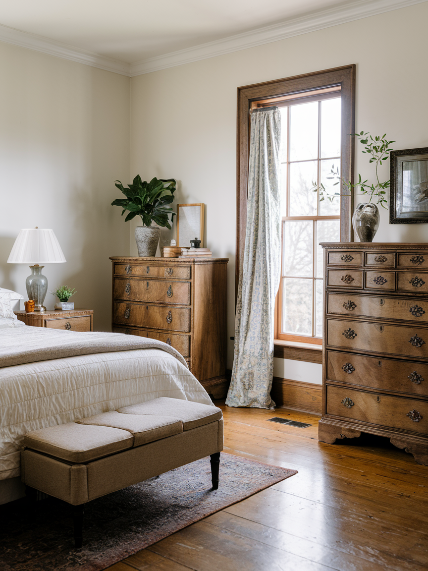 An antique dresser introduces a unique sense of history and craftsmanship that instantly elevates a bedroom. These pieces often feature intricate detailing, rich finishes, and a level of artistry that is difficult to replicate in modern mass-produced furniture. Whether sourced from an antique shop or chosen as a vintage-inspired reproduction, a dresser like this adds depth and personality. Beyond aesthetics, it offers practical storage that helps keep the room organized, reinforcing the idea that traditional design values both beauty and function in equal measure.