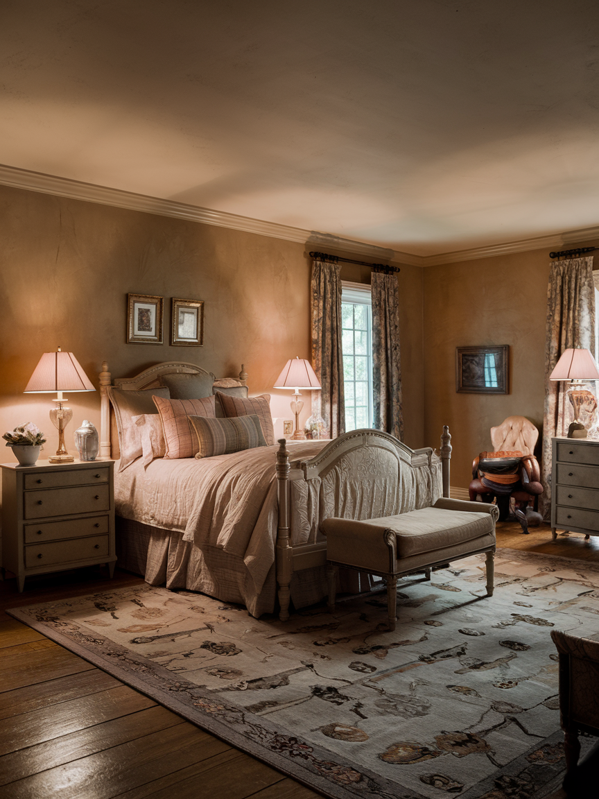 Soft lighting is essential for creating a warm and inviting atmosphere in a traditional bedroom. Table lamps with classic bases and fabric shades diffuse light gently, producing a cozy glow that enhances relaxation. Layering lighting sources, including bedside lamps and accent lights, adds depth and flexibility to the space. This approach allows you to adjust the mood throughout the day, from bright and functional to soft and intimate, making the bedroom feel both practical and serene.