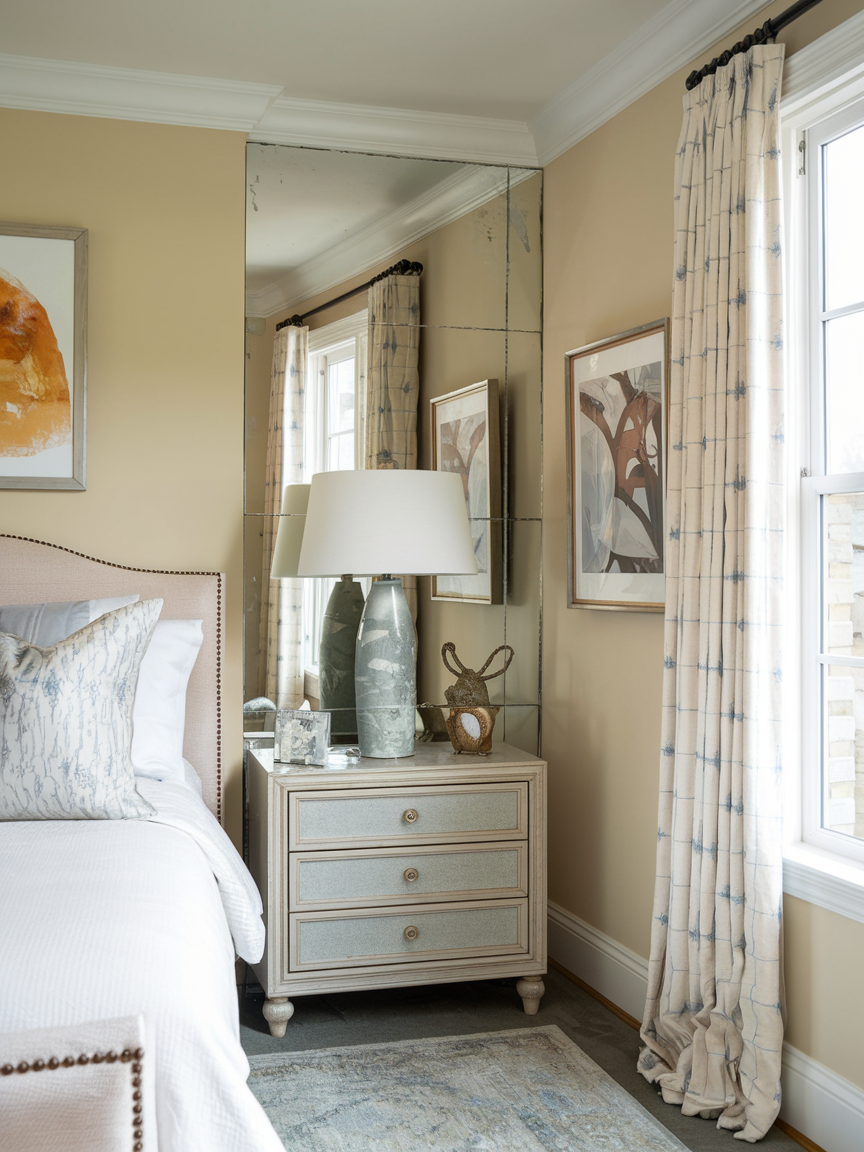Adding a mirror to a bedroom corner is a simple yet powerful way to enhance light, depth, and openness. A tall floor mirror or a decorative framed piece can reflect natural light from nearby windows, instantly making the room feel brighter and more spacious. Choose a frame that complements your design style, whether minimalist, vintage, or modern. Pair the mirror with a small plant, stool, or soft rug to create a styled vignette rather than leaving it standing alone. This reflective corner brings balance and calm while adding a subtle sense of elegance. It also serves a practical purpose, making your bedroom feel both beautiful and functional.