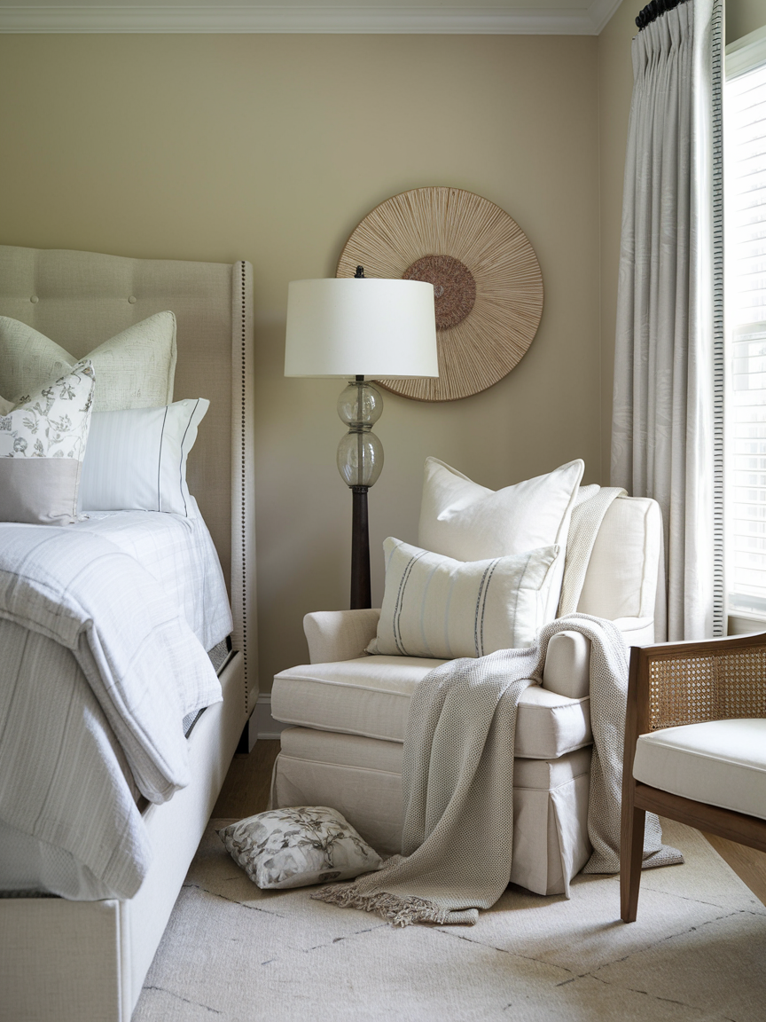 Layering soft textiles in a corner instantly creates a warm and inviting atmosphere. Start with a comfortable chair, bench, or ottoman, then add plush pillows and a cozy throw blanket in complementary tones. Including a soft area rug underneath helps define the space and adds an extra layer of comfort underfoot. Mixing textures such as knit, faux fur, linen, or velvet creates visual depth while maintaining a relaxed feel. This corner becomes the perfect place for reading, sipping tea, or simply enjoying a quiet moment. The combination of softness and warmth encourages relaxation, making the bedroom feel more nurturing and thoughtfully styled.