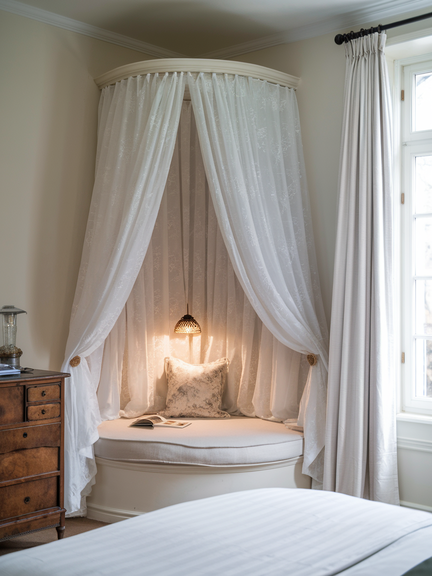 Draping sheer curtains or lightweight fabric around a corner instantly creates a soft, romantic retreat. This idea works beautifully around a small chair, floor cushion area, or reading nook. The flowing fabric adds movement and elegance while creating a sense of privacy and calm. Choose light, airy materials in neutral or pastel tones to maintain a serene atmosphere. Adding string lights or a small lamp behind the fabric can create a gentle glow that enhances the dreamy effect. This canopy corner feels intimate and comforting, making it a perfect escape for relaxation, meditation, or quiet moments at the end of the day.