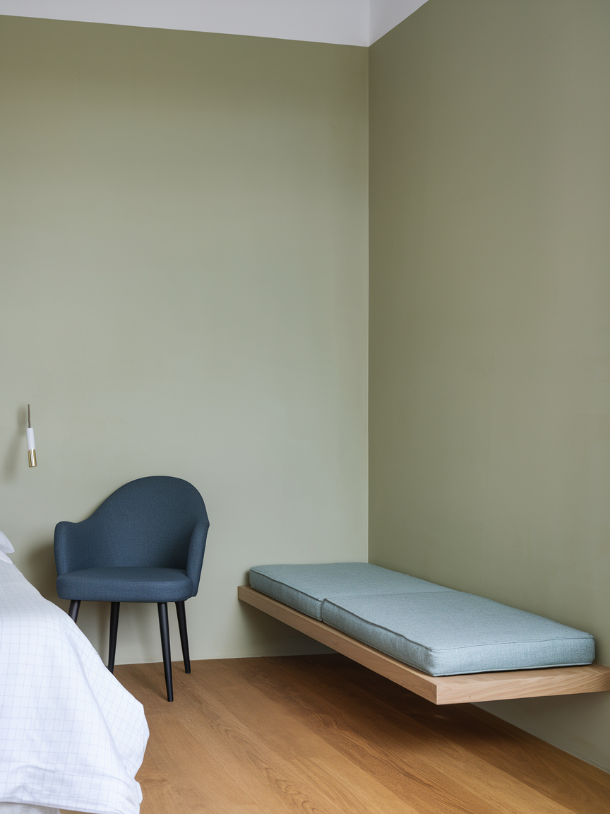 A floating bench offers a modern, space-saving solution that keeps your bedroom feeling open and uncluttered. Mounted to the wall, it creates a clean, minimalist look while still providing practical seating. Add a slim cushion or a few decorative pillows to soften the design and increase comfort. Placing a small basket or storage box underneath helps keep essentials organized without crowding the space. This type of corner works especially well in smaller bedrooms where floor space is limited. The streamlined design maintains a light, airy atmosphere while adding functionality and a subtle architectural element to the room.