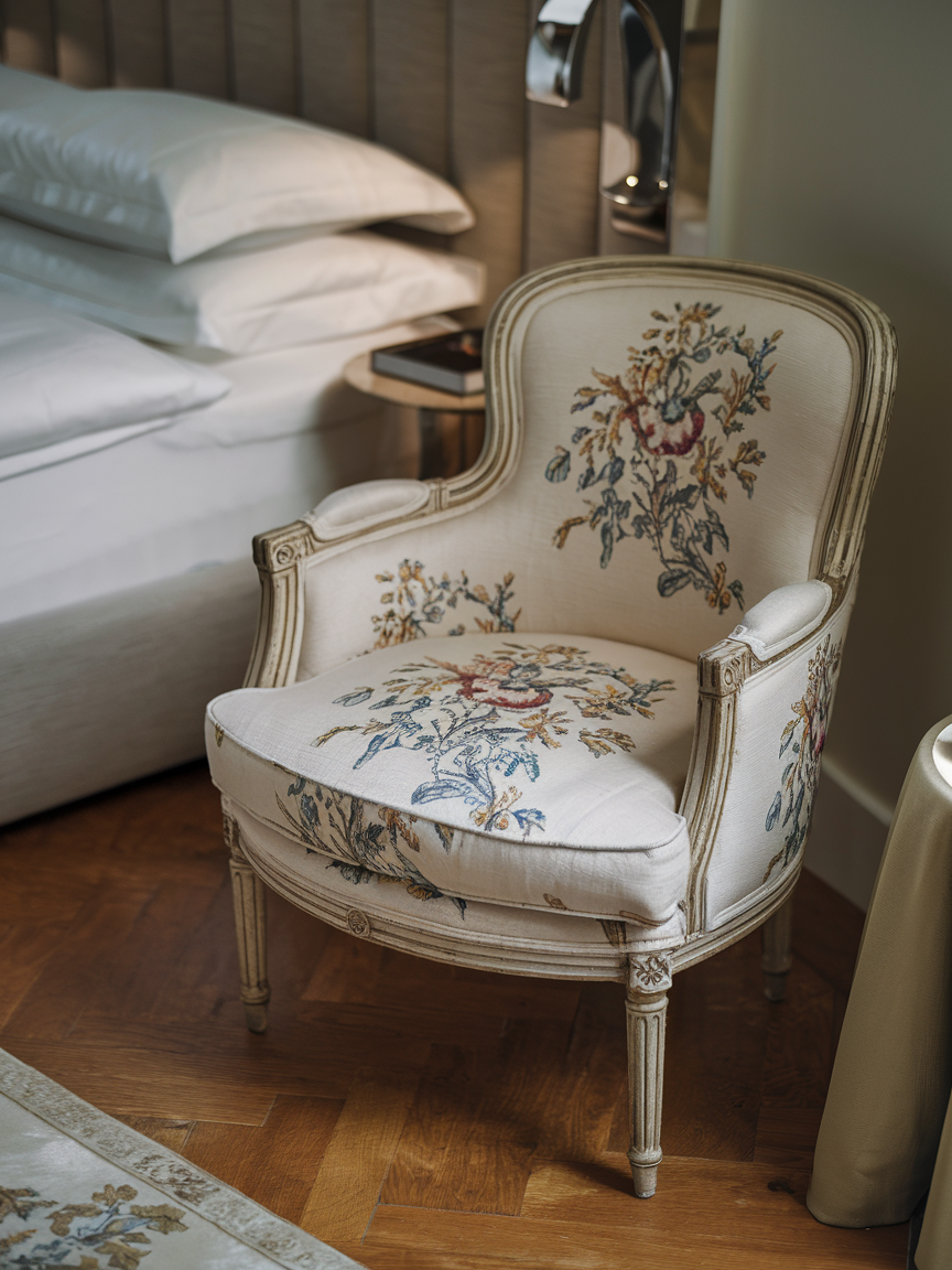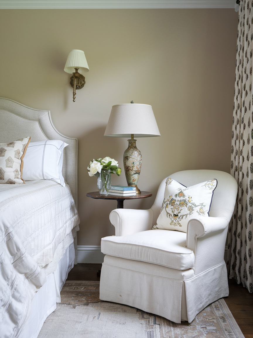 An upholstered chair instantly adds sophistication and comfort to any bedroom corner. Select a design that complements your color palette and overall style, whether modern, classic, or minimalist. Enhance the space with a soft throw, a decorative pillow, and a small side table for books or tea. A nearby floor lamp or wall sconce provides soft lighting for evening relaxation. The padded texture and supportive design make this corner perfect for reading, journaling, or quiet reflection. With thoughtful styling, this elegant setup becomes a peaceful personal retreat that balances comfort with refined design.