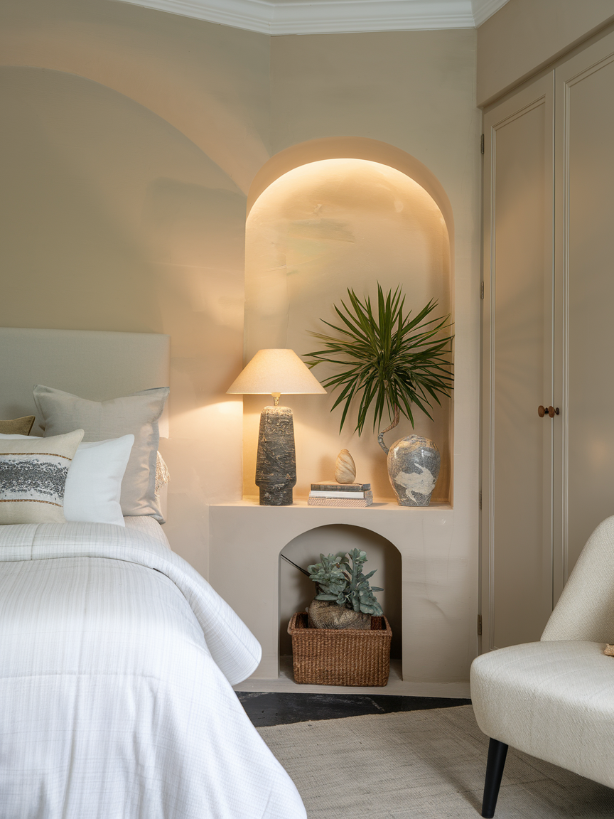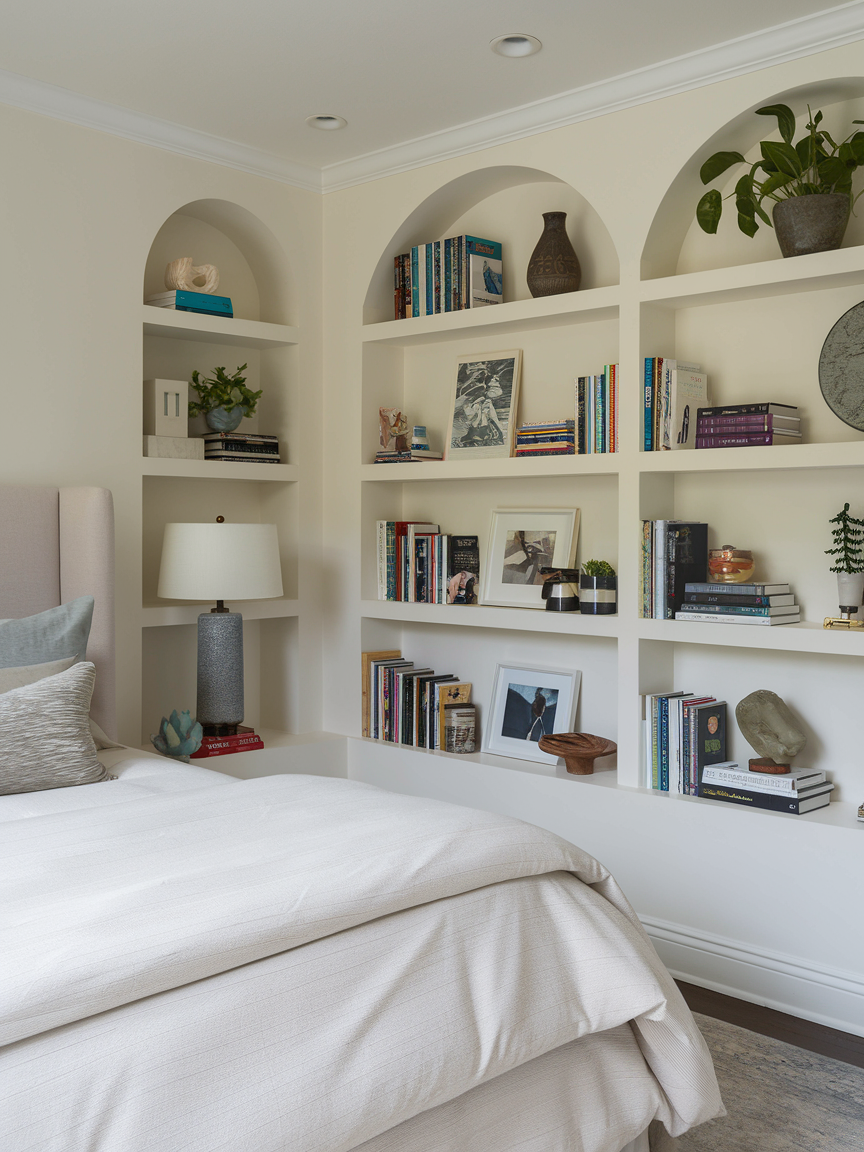 Built-in corner shelving is an excellent way to maximize space while creating a seamless and polished look. Custom or modular shelving allows you to store books, plants, decorative objects, or personal mementos in an organized and visually pleasing way. To maintain a serene atmosphere, balance open space with styled items and avoid overcrowding the shelves. Mixing textures, such as ceramics, wood, glass, and greenery, adds depth without feeling busy. Soft lighting, like LED strip lights or a nearby lamp, can enhance the display and create a warm glow. This type of corner blends storage and decoration beautifully, helping your bedroom feel both functional and thoughtfully designed.