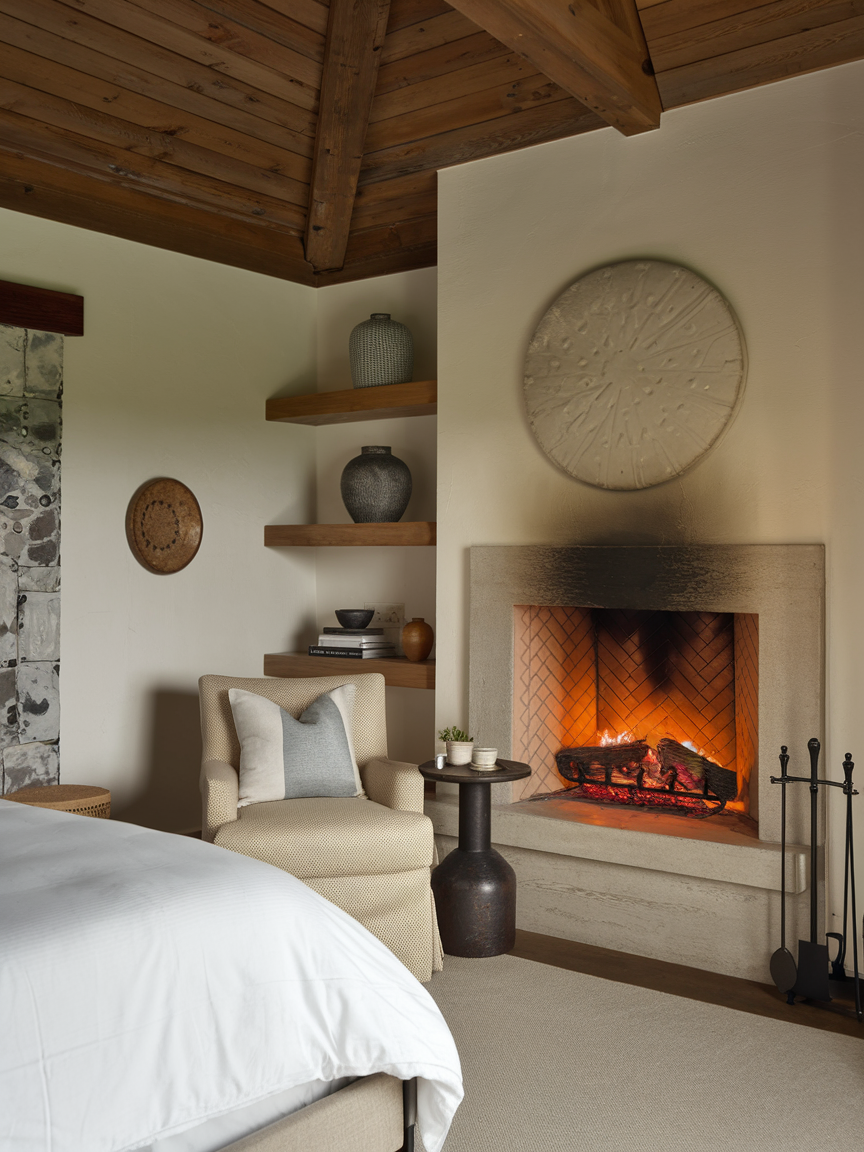 If your bedroom includes a fireplace—traditional or electric—arranging a seating area nearby creates an irresistibly warm and inviting corner. A comfortable chair, small loveseat, or floor cushions positioned close to the gentle glow instantly enhances the room’s sense of comfort. The flickering light adds movement and ambiance, making the space feel peaceful and intimate. Add a soft rug, a throw blanket, and a small table for books or tea to complete the setup. This corner becomes the perfect spot for quiet evenings, relaxation, or reflection, adding both visual warmth and emotional comfort to your personal sanctuary.