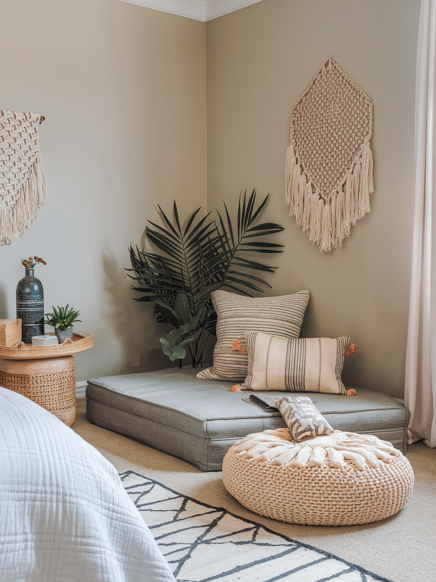For a laid-back and cozy atmosphere, layer plush floor cushions, poufs, or a bean bag in an empty corner. Soft blankets and textured pillows enhance comfort while creating a casual, welcoming feel. This flexible space works beautifully for meditation, stretching, journaling, or simply relaxing at the end of the day. The low-profile design keeps the room feeling open while adding warmth and personality.