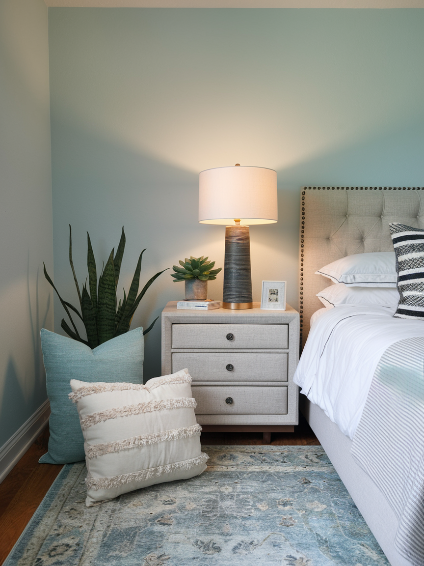 Lighting plays a key role in shaping the mood of your bedroom, and dedicating a corner to soft illumination can dramatically enhance its calming effect. Use a floor lamp, table lamp, or string lights with warm-toned bulbs to create a gentle glow that feels relaxing and inviting. Adjustable lighting allows you to control brightness depending on the time of day or activity. Pair the light source with a comfortable chair, small table, or plant to complete the vignette. This softly lit corner becomes an ideal space for winding down in the evening, reading quietly, or simply enjoying a peaceful moment away from bright overhead lighting.