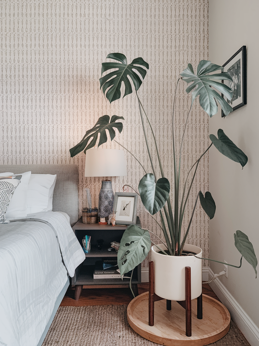 Bring life and tranquility into your bedroom by styling a corner with tall indoor plants or a layered collection of greenery. Statement plants such as palms or large-leaf varieties add height and softness, while smaller plants introduce texture and visual interest. Decorative planters that match your interior style help the arrangement feel cohesive. This natural element promotes a calming environment and creates a refreshing focal point.