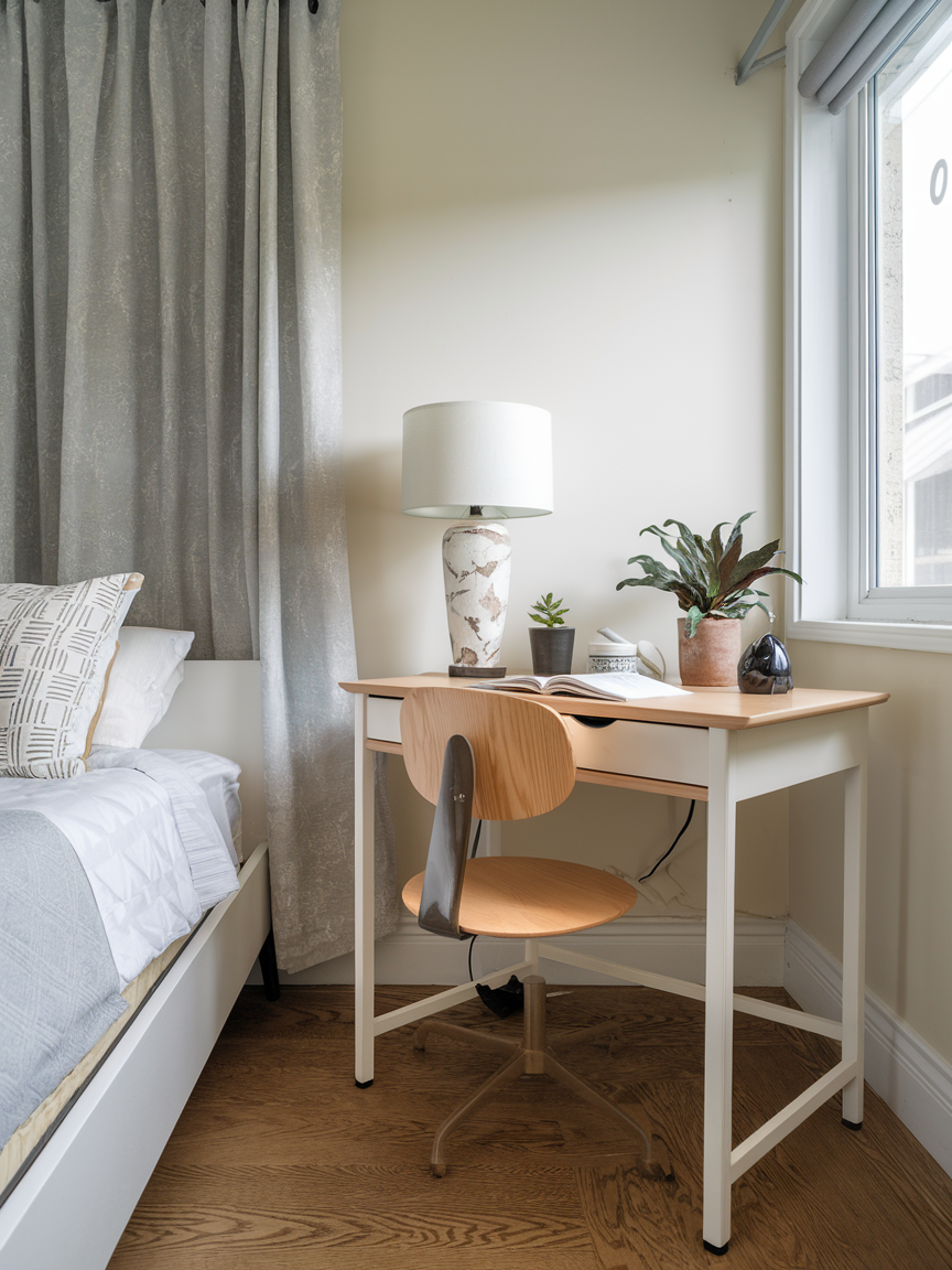 A compact desk placed in a corner offers a quiet space for journaling, planning, or light work. Choose a clean-lined desk and a comfortable chair to maintain an uncluttered look. Add a small lamp, a plant, or a framed photo to personalize the area without overwhelming it. This simple setup allows productivity to coexist with the bedroom’s peaceful atmosphere.