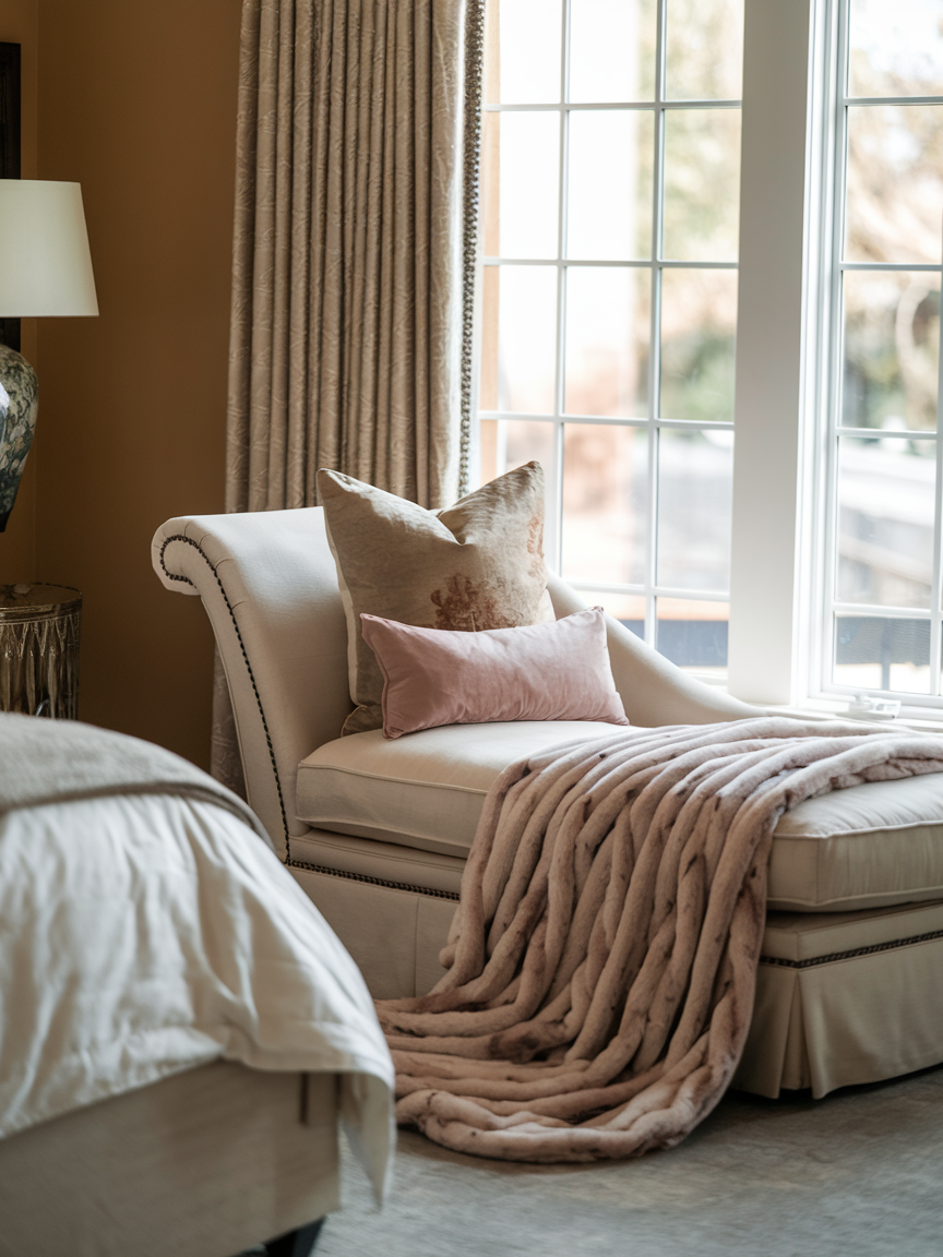 A chaise lounge instantly elevates a bedroom corner into a luxurious relaxation zone. Positioned near natural light or paired with a soft lamp, it becomes an ideal spot for reading or resting. Layer it with plush pillows and a textured throw to enhance comfort and visual softness. This addition brings both sophistication and serenity to the space.