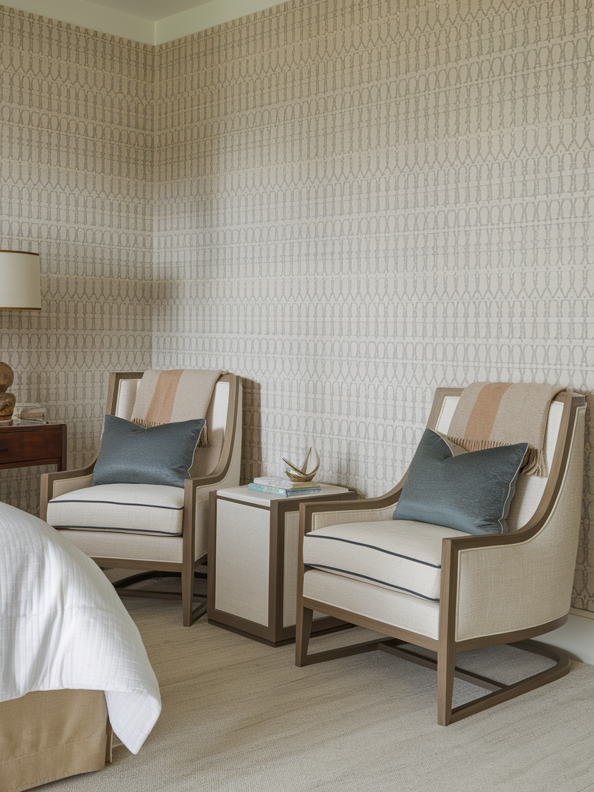 Creating a compact seating area with one or two accent chairs instantly gives your bedroom a sense of comfort and sophistication. Choose chairs with soft upholstery, gentle curves, or warm textures to maintain a relaxing feel. A small side table placed between the chairs can hold a book, a cup of tea, or a candle, making the space both functional and inviting. Layer the chairs with plush cushions or a cozy throw to soften the look and encourage relaxation. This corner works beautifully for quiet conversations, morning coffee, or moments of reflection. When styled thoughtfully, it adds balance to the room while creating a peaceful retreat within your personal sanctuary.