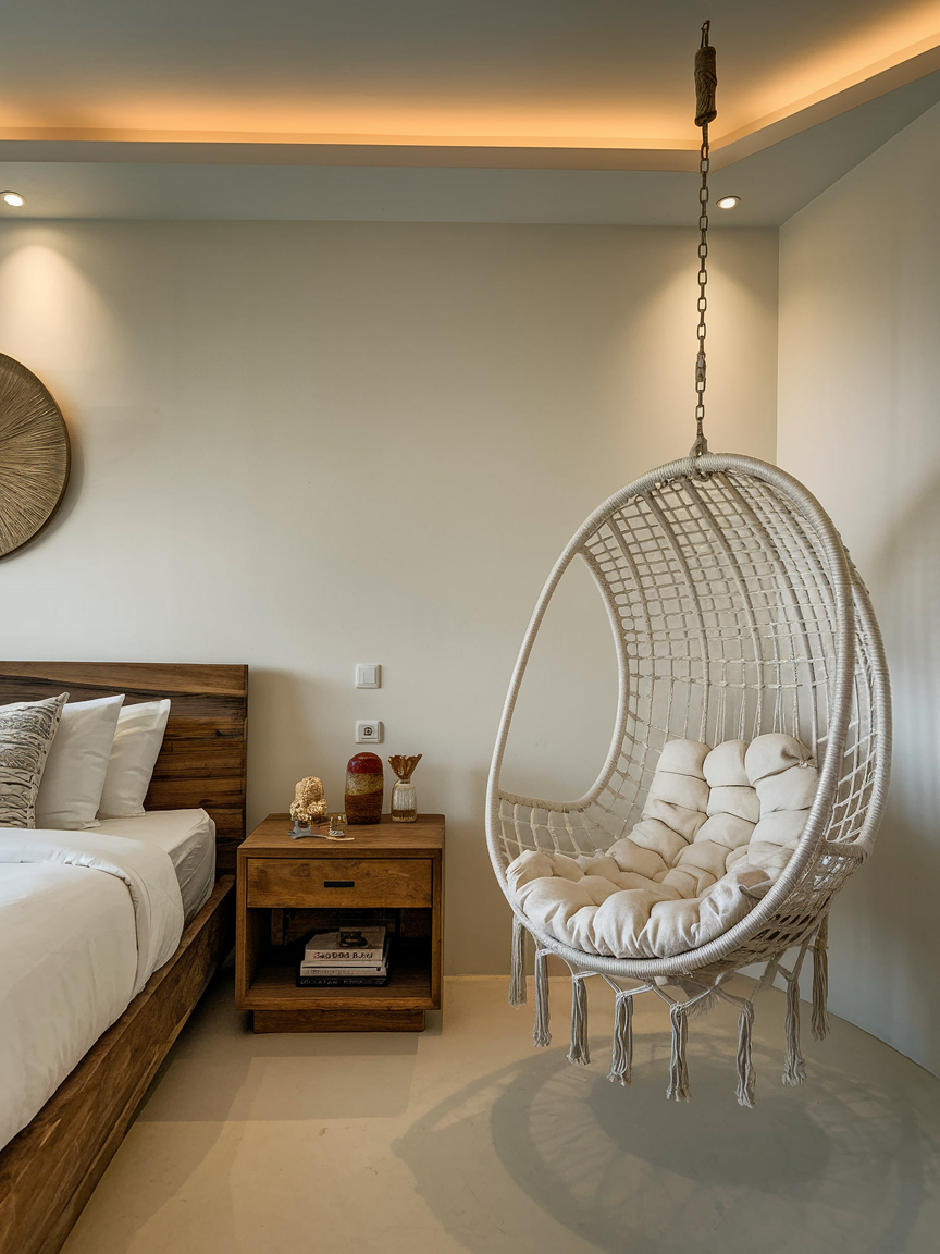 A hanging chair introduces a playful yet tranquil element that instantly makes a bedroom feel more unique and relaxing. Suspended from the ceiling or a sturdy stand, it creates a gentle floating sensation that encourages rest and calm. Position it near a window to enjoy natural light and outdoor views, or place it beside a soft floor lamp for evening relaxation. Layer the chair with plush cushions, textured throws, or soft fabrics to enhance comfort and warmth. This corner becomes a soothing spot for reading, listening to music, or simply unwinding after a long day. Its sculptural presence also adds visual interest, making the corner both functional and beautifully styled.