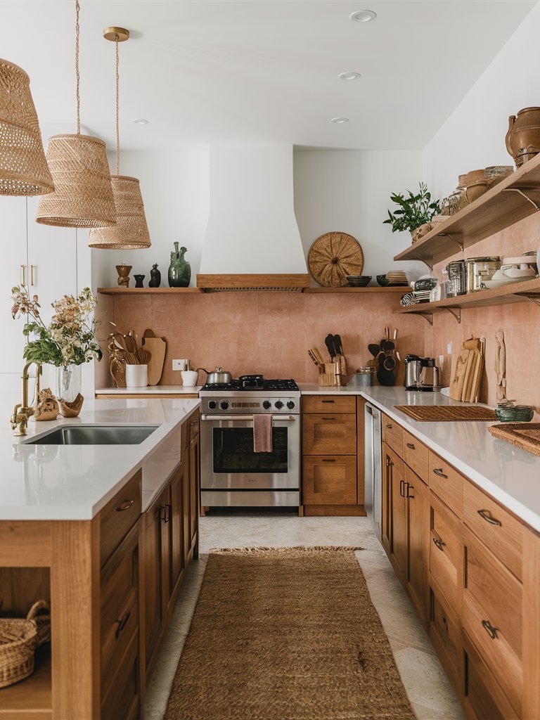 This kitchen’s natural wood cabinetry serves as the foundation of its boho charm. The warm wood tones create an inviting and earthy atmosphere that feels both timeless and contemporary. The cabinetry’s simple, clean lines avoid overly ornate detailing, ensuring the design remains versatile and uncluttered. Its organic appeal harmonizes perfectly with the other natural textures in the room, such as the woven pendant lights and the jute runner. This choice of cabinetry also reflects a commitment to quality and sustainability, as the wood’s natural grain adds character and individuality to the space. Whether paired with bold accents or muted décor, the cabinetry offers an adaptable base for a variety of boho-inspired design elements. Its subtle elegance ensures it doesn’t compete for attention, allowing the other design features to shine while still playing a critical role in the kitchen’s overall aesthetic.
