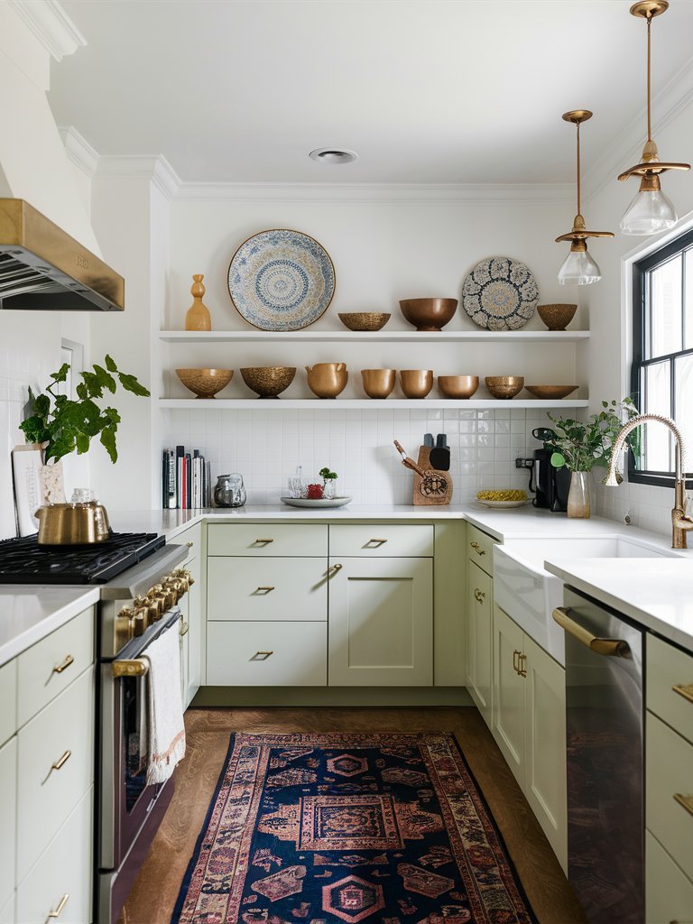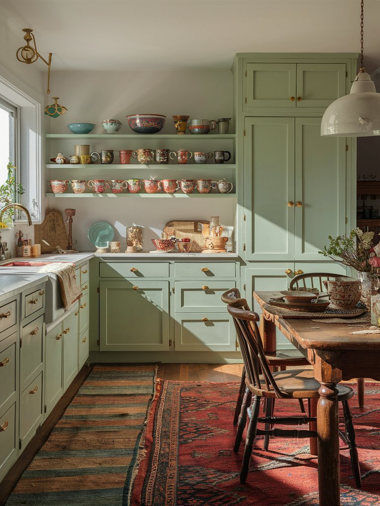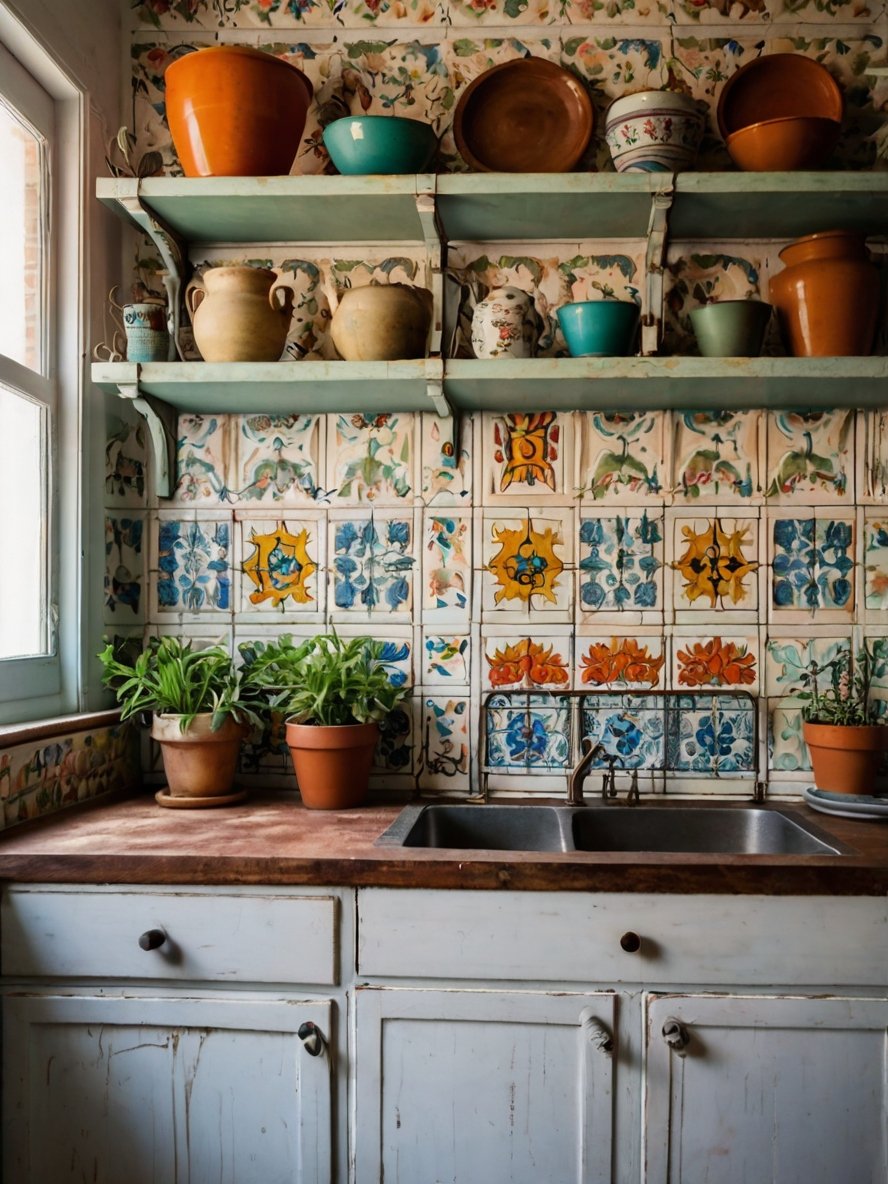 The open shelves are adorned with an array of colorful pottery and earthenware, adding to the eclectic charm of the kitchen. Each piece tells its own story, from brightly glazed bowls to earthy terracotta vases. The display is both functional and decorative, turning everyday kitchenware into an artful exhibit. The pale green shelves themselves add a subtle hint of color that ties in with the tiles, creating a layered and cohesive look.