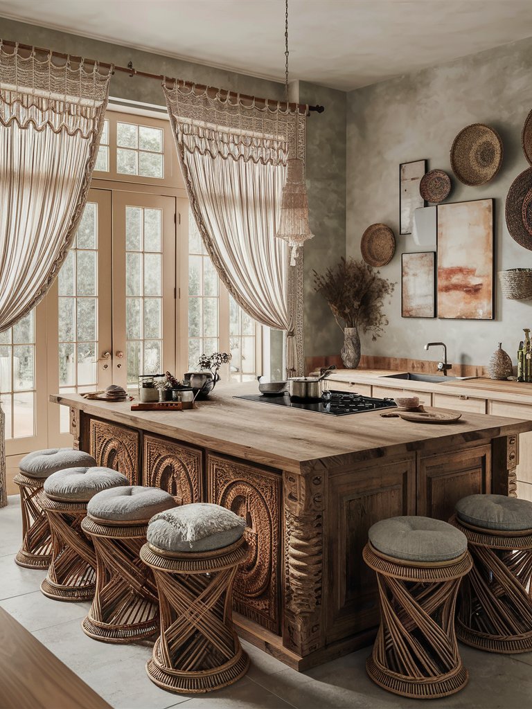 The beautifully carved wooden island stands as the crown jewel of this boho kitchen, blending functionality with intricate craftsmanship. Its unique detailing draws the eye, offering a level of sophistication that elevates the entire space. The natural wood grain and ornate carvings exude warmth and heritage, adding an artisanal touch that makes the kitchen feel curated rather than manufactured. The large surface of the island ensures ample space for food preparation and casual dining, making it the hub of activity. This piece not only serves a practical purpose but also acts as a statement of traditional artistry, providing a narrative that complements the room’s eclectic charm. The wood’s warm tones harmonize with the natural textures found throughout the kitchen, creating a cohesive aesthetic that is both welcoming and luxurious.