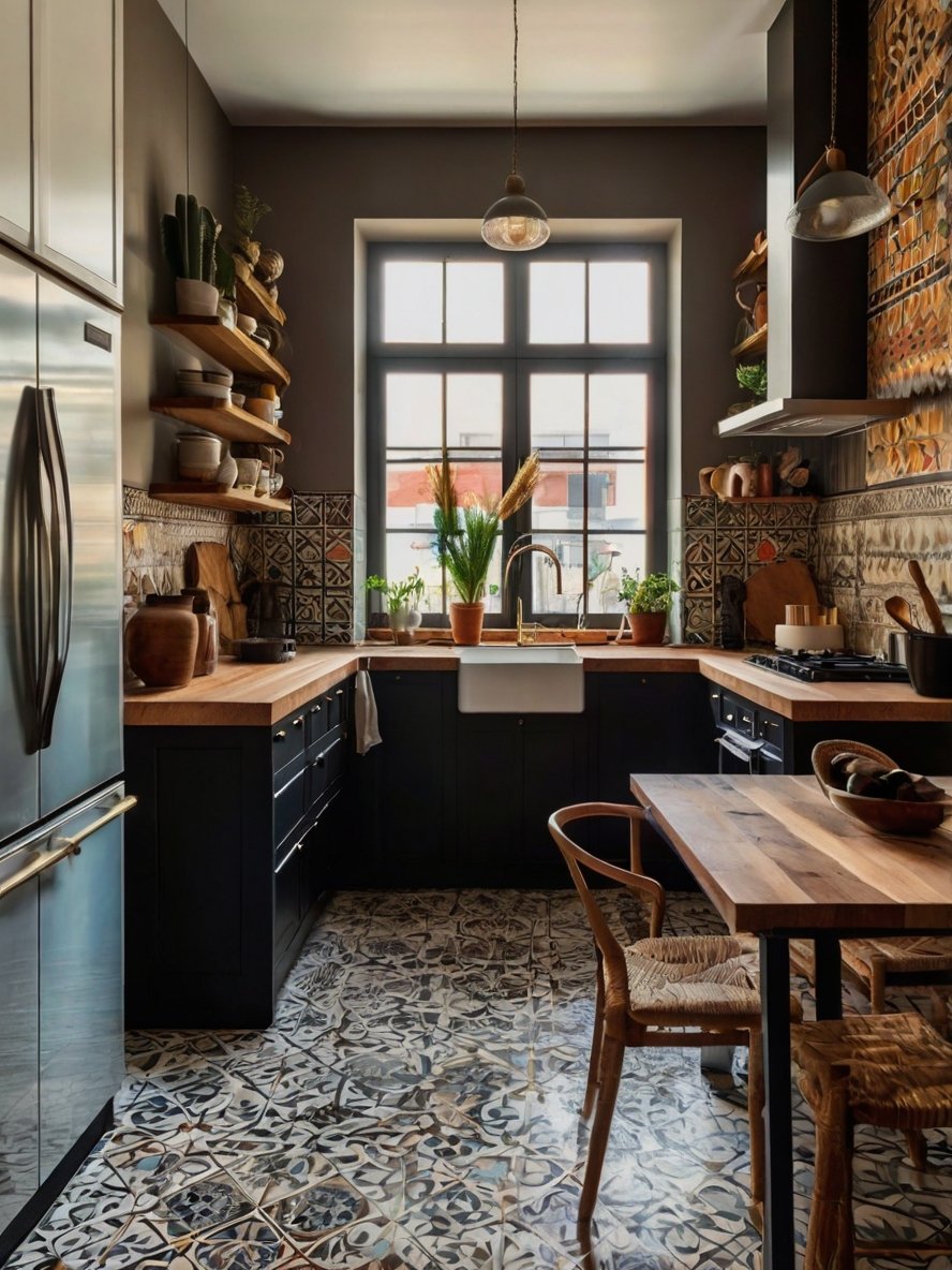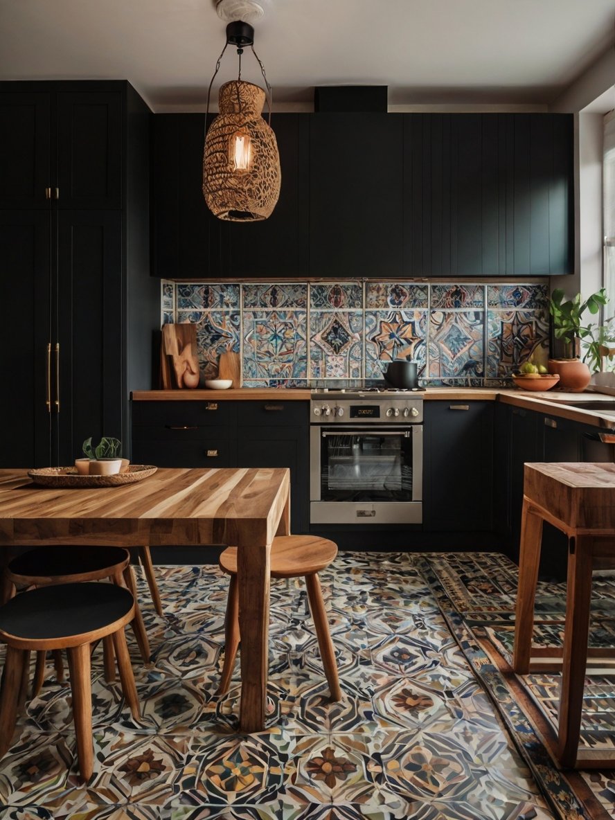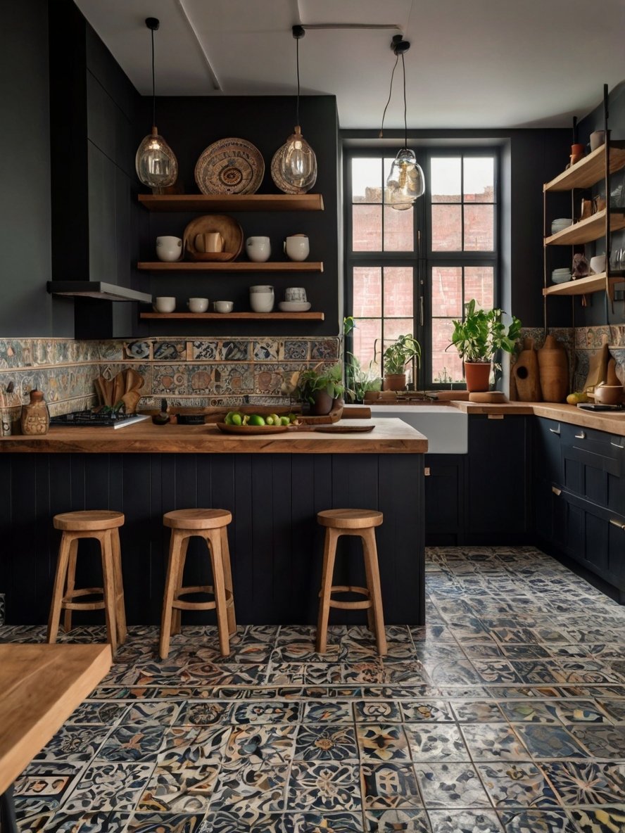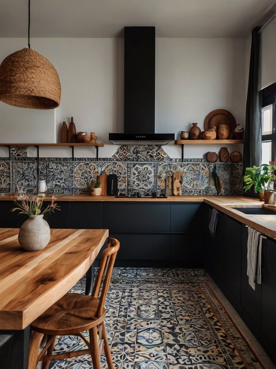 The intricate patterned tiles in this boho kitchen immediately catch the eye, offering a perfect combination of artistry and functionality. Extending from the floor to the backsplash, the tiles bring an eclectic charm to the space. The blue, black, and beige tones of the patterns complement the earthy elements of the kitchen, such as the wooden countertops and decor pieces. The tiles give the kitchen a lively character, making it feel vibrant and inviting. They also provide an excellent contrast to the sleek black cabinetry, ensuring the space doesn’t feel overly dark or monotonous.