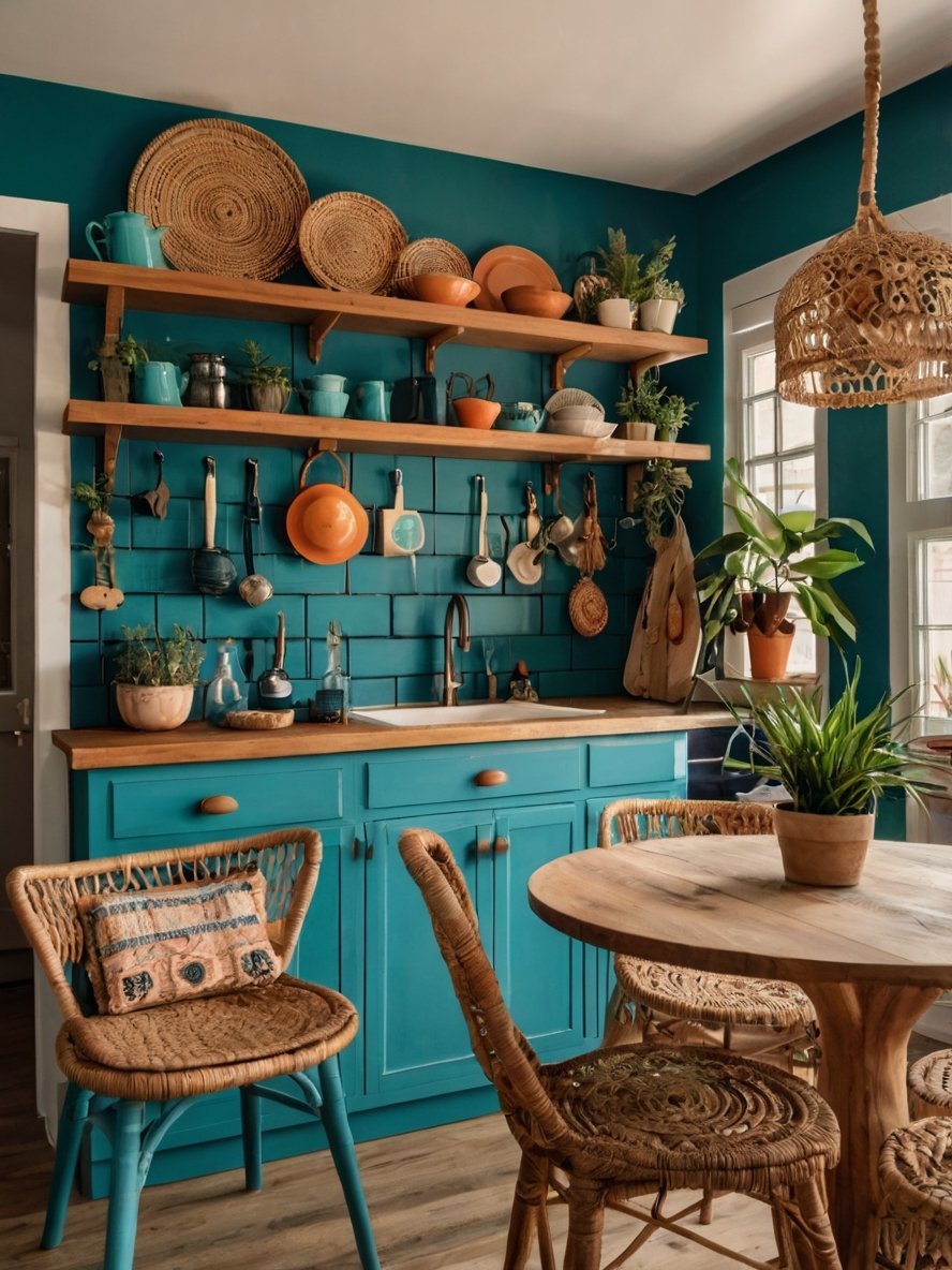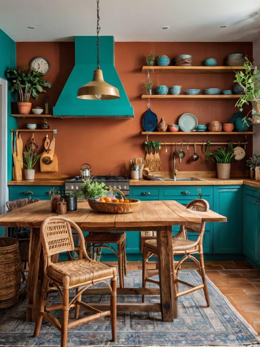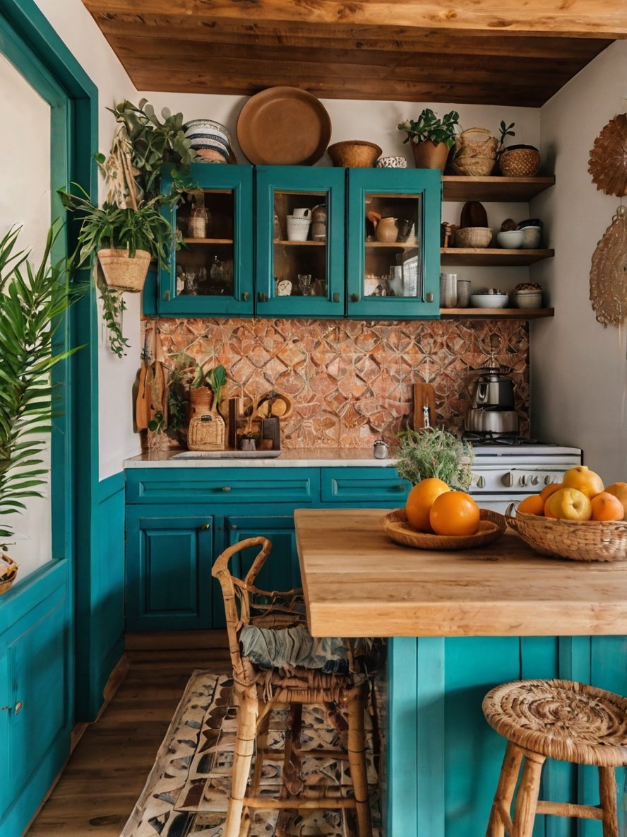 This boho kitchen immediately grabs attention with its vibrant color scheme, dominated by deep turquoise cabinetry and a terracotta accent wall. The combination creates a lively, warm, and earthy atmosphere that exudes creativity and individuality. The bold turquoise stands out as an unexpected yet welcome choice, while the terracotta balances the vibrancy with its grounded, natural tone. This dynamic palette evokes a sense of joy and passion, perfectly capturing the bohemian spirit. Together, these colors make the kitchen feel unique and personal, ensuring it is far from generic.