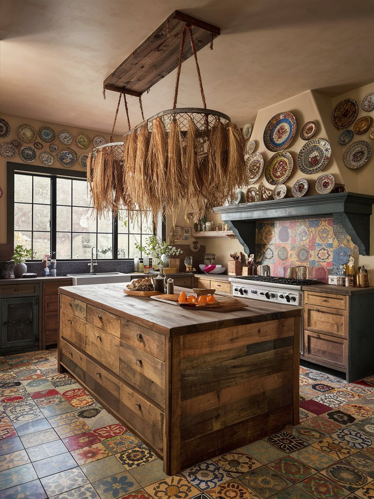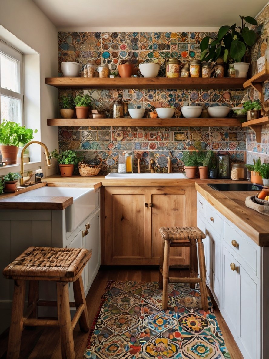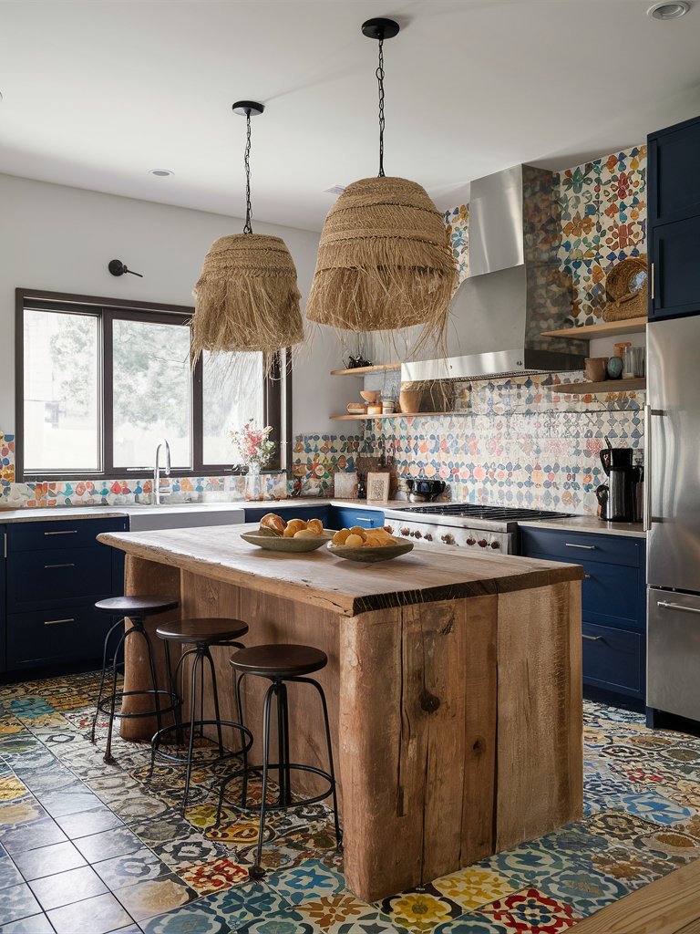 The patterned tile backsplash is a continuation of the vibrant flooring, ensuring the kitchen feels cohesive and intentional. The backsplash brings the same colorful, artistic energy to the walls, creating a seamless flow that ties the design together. Its intricate patterns draw the eye upward, adding depth and dimension to the space. The backsplash not only acts as a decorative feature but also serves a functional purpose by protecting the walls from spills and stains. The tiles are easy to clean, making them a practical choice for a busy kitchen. Their placement behind the stove and countertops ensures they remain a focal point, further enhancing the boho aesthetic. This creative use of patterns demonstrates a fearless approach to design, celebrating