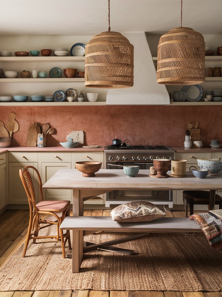 The kitchen’s earthy tones, ranging from the clay-colored backsplash to the soft beige cabinetry, envelop the space in a warm and inviting atmosphere. These hues are a quintessential hallmark of boho design, creating a seamless connection to nature. The clay tones evoke a grounding effect, while the neutral cabinets provide a calming backdrop. This color palette ties together the natural wood floors, woven pendant lights, and rustic dining table, making the space cohesive yet dynamic. The earthy tones also work as a versatile canvas, allowing the curated display of ceramics and decor to pop. This balance between subtlety and vibrancy ensures the kitchen feels both grounded and alive, embodying the bohemian spirit of comfort and creativity.