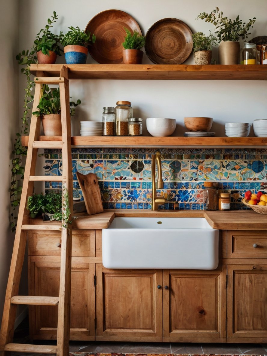 The wooden ladder leaning against the shelves is both practical and whimsical. It provides easy access to the higher shelves while adding a playful, eclectic touch to the kitchen. The ladder’s raw wood finish complements the cabinetry and shelves, reinforcing the natural theme of the space. It also adds a sense of movement, making the kitchen feel dynamic and inviting. This feature not only enhances functionality but also emphasizes the bohemian principle of blending practicality with aesthetic charm.