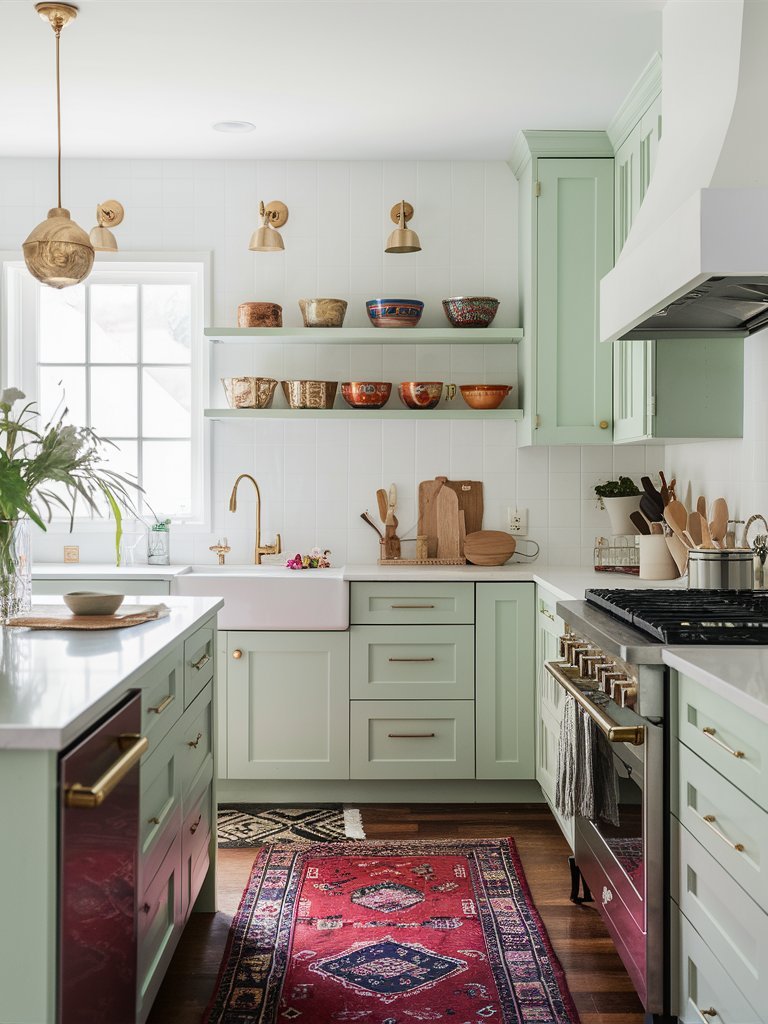 The soft mint green cabinetry is the star of this boho kitchen, creating an atmosphere of freshness and tranquility. This unique color choice distinguishes the space, breaking away from traditional kitchen designs. The pastel tone complements the white walls and backsplash, while also providing a subtle contrast to the rich wooden flooring. Mint green is versatile, pairing seamlessly with both vibrant and neutral accents. This palette ensures the kitchen feels lively and cheerful without being overwhelming. It’s a color that embodies the boho spirit—playful, eclectic, and effortlessly stylish, while offering a clean and calming aesthetic that enhances the room’s functionality.