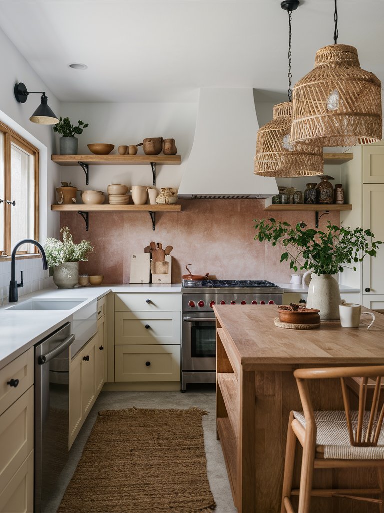 The choice of soft beige cabinetry is a subtle yet impactful design decision that keeps the space feeling light and airy. This neutral tone serves as the perfect canvas for the other natural elements in the kitchen, such as the wooden accents and woven textures. The cabinets strike a balance between modern minimalism and rustic charm, creating a cohesive look that’s both timeless and trendy. The matte finish adds a contemporary touch, while the black knobs introduce subtle contrast. These cabinets are both practical and beautiful, offering ample storage while maintaining the kitchen’s relaxed boho aesthetic.