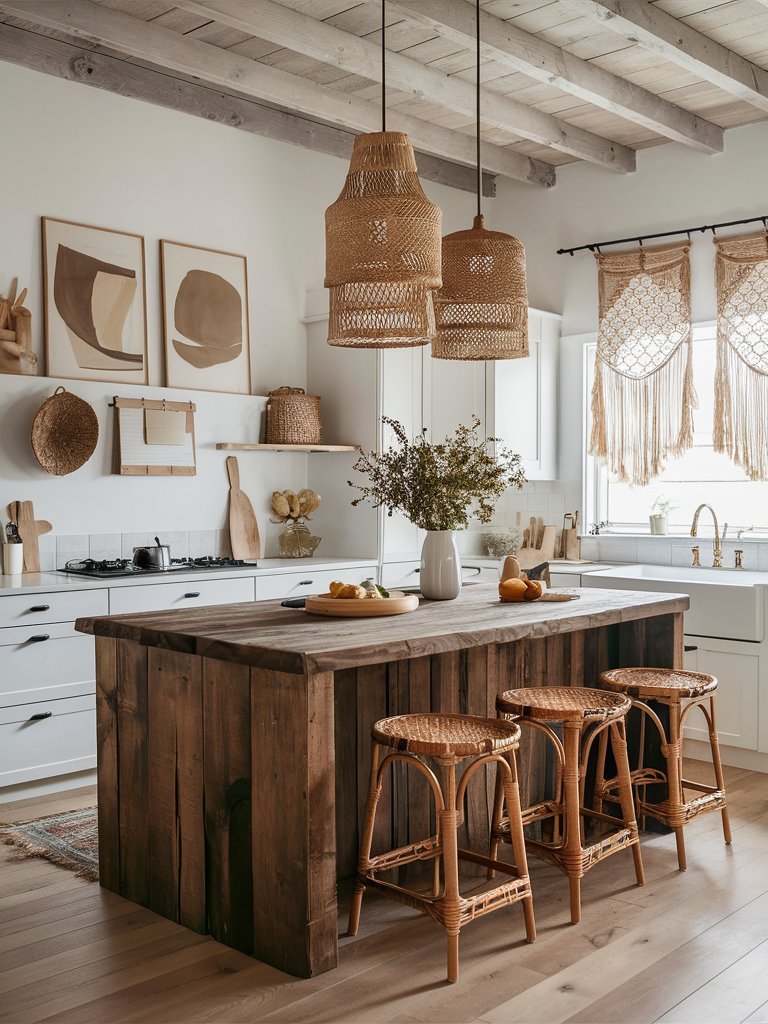 The neutral-toned wall art above the counter subtly enhances the kitchen’s aesthetic without drawing too much attention. Its abstract designs and muted colors align seamlessly with the boho theme, adding an element of sophistication to the rustic backdrop. This minimalist choice of art complements the room’s other features, acting as a visual balance against the more intricate textures like the macramé curtains and woven lighting. It’s a reminder that even the smallest details in boho design contribute to the overall harmony of the space.