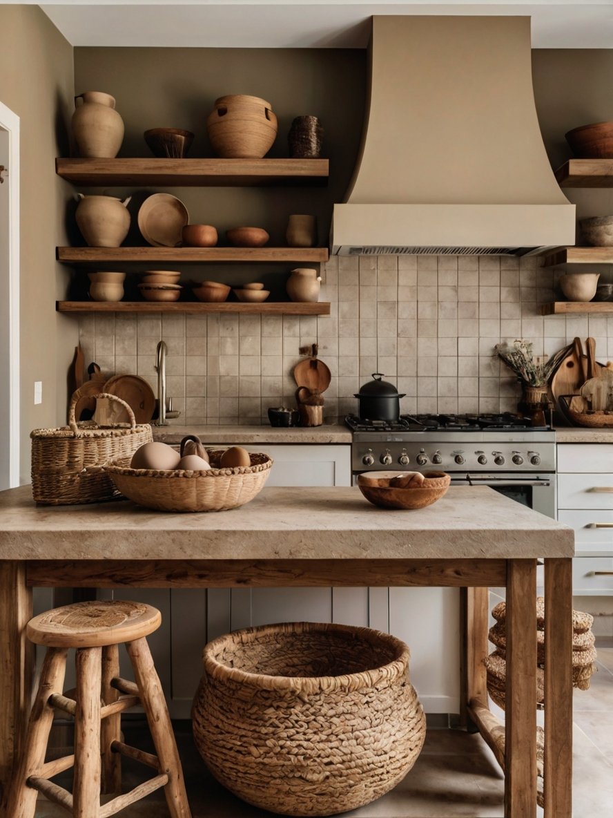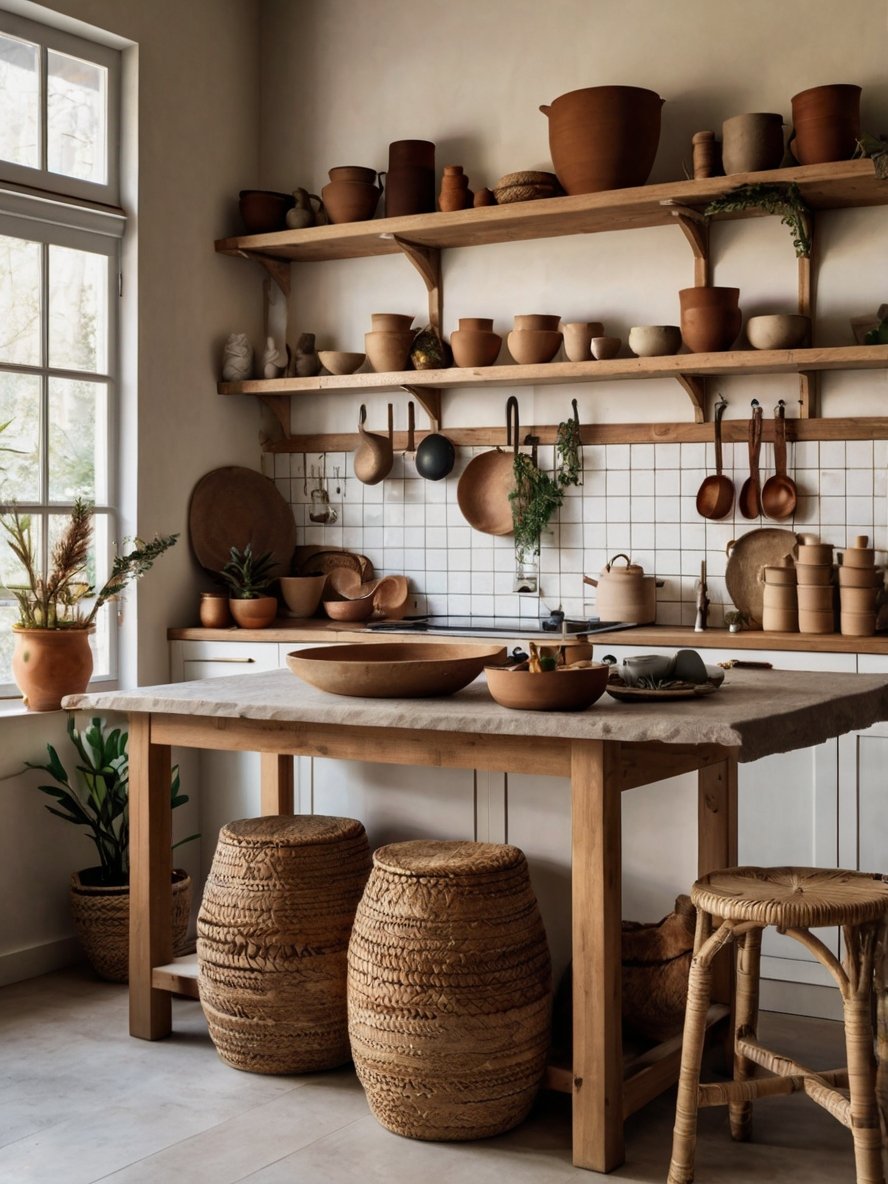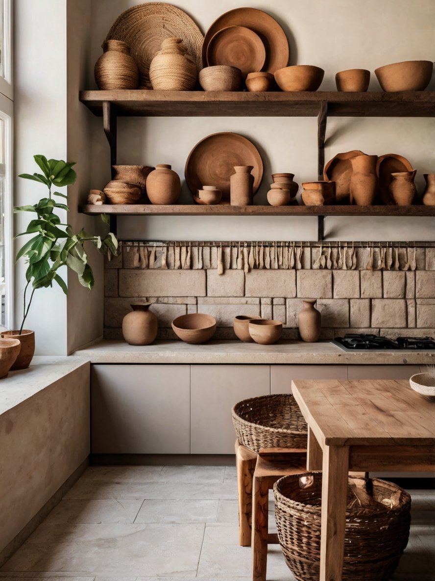 The artisanal ceramics featured in this kitchen add a warm, rustic charm to the space, elevating the overall aesthetic with their handcrafted appeal. Displayed prominently on the open wooden shelves, the natural imperfections and earthy tones of the pottery create a cohesive, organic feel that complements the kitchen’s neutral palette. These ceramics not only serve as functional tools but also act as decorative elements that reflect craftsmanship and timeless artistry. Their presence brings a sense of authenticity and warmth, making the kitchen feel inviting and cozy, while the variety of shapes and sizes adds visual interest without overwhelming the space.